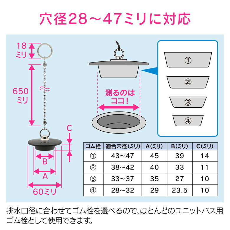 【商品情報】●パーツの組み合わせでさまざまな排水穴径に対応ができます。●浴槽に溜めたお湯の水量の減りが早くなった際はゴム栓の交換時期です。●クサリ付きのため、まとめて交換できます。●交換する排水口サイズが分からない場合でも対応できるので、工事業者様のストック用としても便利です。●経年劣化による汚れや破損時の交換に便利な交換用パーツです。●マンションやアパートなどの賃貸住宅での交換や原状回復にもオススメです。●汎用的なサイズに対応できるため、TOTO、LIXIL、Panasonic、タカラスタンダード、クリナップなどのユニットバスについているゴム栓と互換性があります。【商品仕様】●パッケージサイズ(約):奥行/33mm、幅/165mm、高さ/125mm●パッケージ重量(約):110g●材質:エチレンプロピレンゴム●生産国:日本●対応排水口径(約):28〜47mm●チェーン長さ(約):650mm(玉径:4.5mm)【注意事項】●必ず排水口のサイズをご確認ください。●ご使用のゴム栓はすり減りや変形により正確な寸法ではない場合があります。【使用方法】[キーワード]ガオナ 万能ゴム栓 お風呂用 対応排水口径28〜47ミリ クサリ付き 長さ65cm 交換用 ツバ付き マルチ式 GA−FQ020