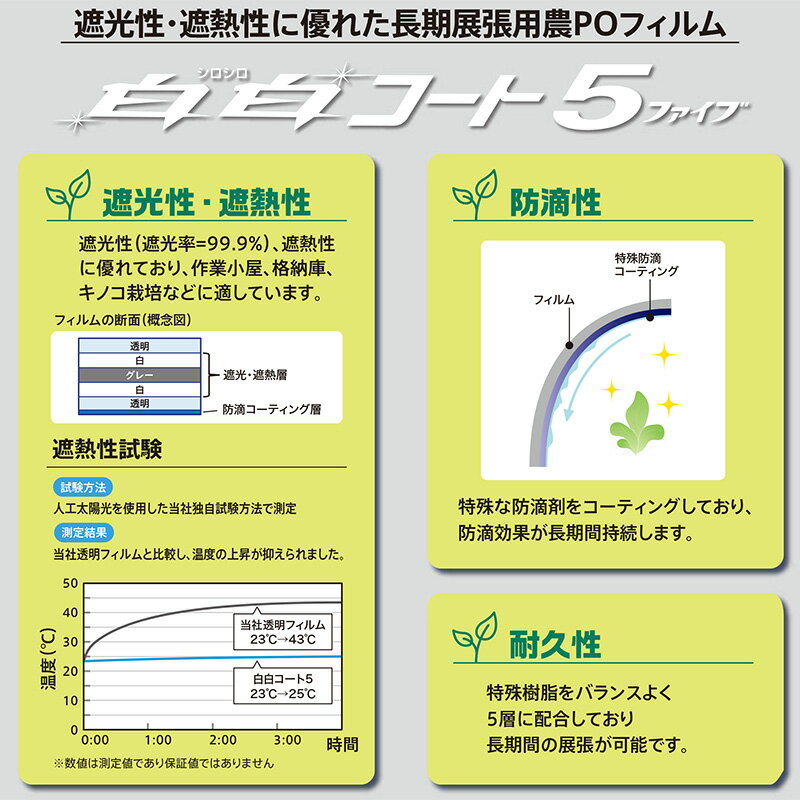 厚み:0.15mm 幅 :230cm 長さ:30m 遮光・遮熱タイプ長期展張塗布型農PO ・遮光性(遮光率=99.9%)、遮熱性に優れており、作業小屋・格納庫・キノコ栽培などに適しています ・特殊な防滴剤を塗布(コーティング)しており、防滴効果が長期間持続します ・特殊樹脂をバランスよく5層構造へ配合し、優れた強度・耐久性があります 用途:外張り用・サイド用 使用上の注意 「白白コート5」には表と裏があります。 フイルムに印刷された文字がハウスの「内側」から見て正しく読めるように展張してください。類似商品はこちら白白コート5 0.15mm 幅230cm 5067,854円白白コート5 0.15mm 幅1000cm 3174,174円白白コート5 0.15mm 幅930cm 30162,162円白白コート5 0.15mm 幅900cm 30157,014円白白コート5 0.15mm 幅840cm 30146,718円白白コート5 0.15mm 幅800cm 30139,854円白白コート5 0.15mm 幅740cm 30129,558円白白コート5 0.15mm 幅700cm 30122,694円白白コート5 0.15mm 幅660cm 30115,830円新着商品はこちら2025/11/29ツリークリップ 10個入 100パック マツモ72,358円2025/11/29底面吸水用テープ 鉢用 15mm×10m 2016,360円2025/11/29止め具 ひっかけタイ 160mm 4本入 5016,016円再販商品はこちら2025/12/1ペレット種子 300粒 ミズナ 京みぞれ 品番580円2025/12/1ペレット種子 100粒 レタス マリア 品番3522円2025/12/1ペレット種子 150粒 ハクサイ 無双 品番3580円2025/12/01 更新強度・防滴性・耐候性・透明性・防霧性に優れた農POシリーズです。 遮光・遮熱タイプ長期展張塗布型農PO