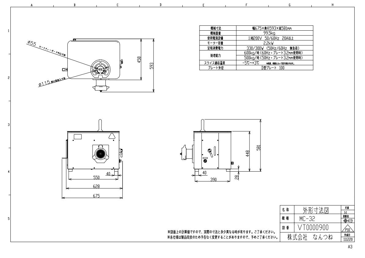 挽きの仕上がり抜群!ひときわ新鮮!*−5℃から+3℃まで挽くことができ、常温でもきれいなミンチに仕上げます。(肉厚、肉質、形状によって若干異なります)*受け皿が簡単にはずれ、中板もステンレス製のため衛生的です。*オン・オフはボタンを押すだけの簡単操作で、緊急停止をする場合もすぐに対応できます。受け皿を外すと運転が停止する安全装置付です。機械寸法:幅650mmx奥行600mmx高450mm機械重量:90kg使用電源:三相200V 60/50Hz 20Aモータ容量:2.2kW処理能力:600kg/時 (60Hz・プレート目3.2mm使用時) 500kg/時(50Hz・プレート目3.2mm使用時)適用温度:-5℃〜+3℃※肉厚、肉質、形状によって若干異なります。プレート外径:D型プレート100★「送料無料(北海道、沖縄県、離島、一部地域は除く)」ですが、玄関渡しとなります。(北海道、沖縄県、離島の場合は、別途送料が発生致します。予め、ご了承下さい。) なんつね ミートチョッパー