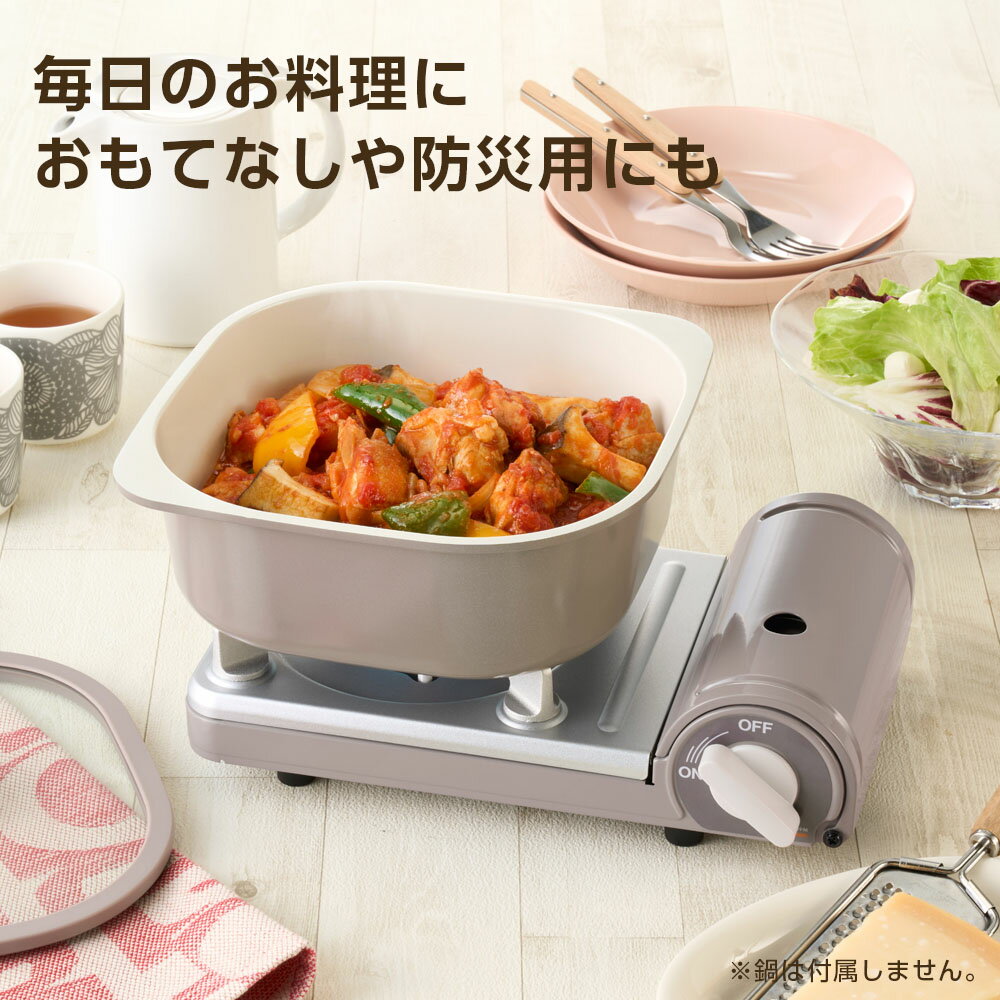 少人数にぴったりなコンパクトサイズ通常のカセットコンロと比較して約4割小さいミニコンロ。1〜2人の使用に最適なミニサイズ。使うときも収納も省スペースだから、一人暮らしや少人数での使用にぴったり。インテリアに合わせて選べる3色お部屋の雰囲気に合わせて、お好みのカラーをチョイス!お気に入りの食卓に。ムダ火を抑えるタテ型炎口バーナー炎の出口「炎口」がタテ長で炎が外に広がりにくく、鍋底からこぼれるムダ火を抑制。持ち運びしやすいコンパクトで軽量(約1kg)なので、おうちでもアウトドアでも手軽に使えて便利です。初めての方にも安心な安全機能カセットガスの着脱は、簡単でガス漏れの心配のないマグネット式。安心の圧力感知安全装置つき。連続燃焼時間イワタニカセットガスジュニア使用時/約56分、イワタニカセットガス使用時/約112分(気温20〜25℃のとき、強火連続燃焼にて1本を使い切るまでの実測値)対応カセットガス(別売)イワタニカセットガスジュニア、イワタニカセットガスご注意当商品をテント内・車内では絶対に使用しないでください。サイズ(約)幅27.9×奥行18.5×高さ8.5cmPSマークの種別種別/PSLPG 届出事業者名/株式会社旭製作所 登録機関名称/日本ガス石油機器検査協会重量(約)1kg材質本体/鋼板(粉体塗装) トッププレート/鋼板(耐熱塗装) ごとく・バーナー/耐熱アルミダイカスト 点火つまみ/ABS樹脂点火方式圧電点火方式安全装置圧力感知安全装置他容器着脱方式マグネット方式製造国日本メーカー岩谷産業商品バリエーションあわせて買いたい
