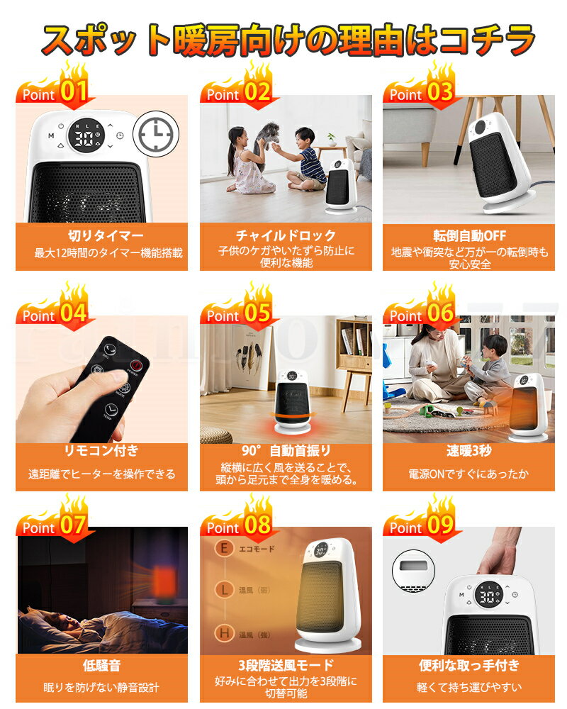 メーカー希望小売価格はメーカーサイトに基づいて掲載しています メーカー希望小売価格はメーカーサイトに基づいて掲載しています メーカー希望小売価格はメーカーサイトに基づいて掲載していますセラミックヒーター 小型 おしゃれ ヒーター 足元 90°自動首振り 遠隔操作 3段階切替 電気ファンヒーター転倒OFF 即暖 省エネ 1500W 脱衣所 お風呂場 寝室 オフィス この冬でそれがあれば十分だ! 節電 防寒対策 ■商品詳細カラー:ホワイトサイズ:18*18*30cm重量:約1.23kg消費電力:最大1500W安全機能:転倒自動OFF、チャイルドロック、冷却機能温度設定:15〜35℃送風モード:温風(強)、温風(弱)、エコタイマー:1〜12時間動作音:35db包装内容:ヒーター本体、リモコン、日本語取扱説明書●セラミックヒーターのならではの使いやすさ・速暖…電源ONですぐに温風が出ます。・無臭…灯油やガスなどの燃料を燃やさないので、嫌な臭いがしません。・換気…不要有毒な排気ガスを出さず、度々換気する必要がありません。・無補充…電気で発熱させて部屋の空気を暖めるので、燃料を補充する必要がありません。●暖房器具の性能だけではなく、セキュリティも大事なこと1.転倒OFF:地震などの不意な原因で転倒すると、電源が自動的に切ります。2.チャイルドロック:設定を固定できるチャイルドロック付きで、小さなお子様やペットがいるご家庭でも安心してご使用していただけます。3.切れ忘れ防止:1~12時間の切りタイマーを設定可能です。外出の時、電源を切れ忘れ時も安心です。4.難燃性:セラミックヒーターのボディはV0級難燃素材を採用しました。 5