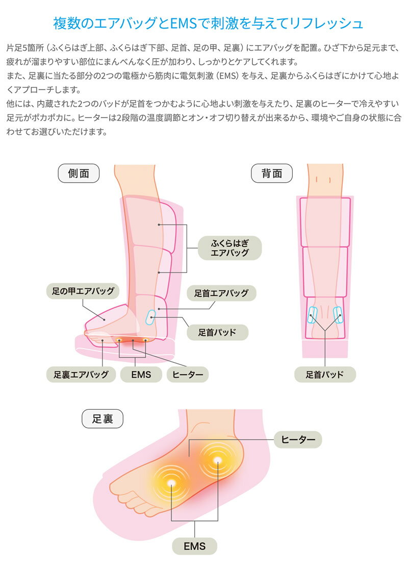 【リフレキュット EMSストレッチブーツ】 EMS エアバッグ 足マッサージャー フットマッサージャー フットケア 充電式 エアーコンプレッション 足元ヒーター 足温熱 脚温機 足 脚 ふくらはぎ 足首 足裏 家電 > 美容・健康家電 > マッサージ機器 > フットマッサージャー ショップ名 レビュー数 RONNE 0件 ◎エアバッグによる加圧と同時に 足裏に当たる部分の電気刺激(EMS)で 心地よいもみ心地♪ ヒーター付きで冬はあったか♪ EMSストレッチブーツ リフレキュット 24,800円(税込) ツイート ■カテゴリ 家電 > 美容・健康家電 > マッサージ機器 > フットマッサージャー