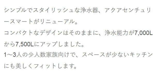 【商品説明】■材料の種類/本体:ABS樹脂、カートリッジ:ABS樹脂、ホース:ポリエチレン、切替コック:ABS樹脂■ろ材の種類/高純度粒状活性炭・イオン交換繊維状活性炭・中空糸膜、ろ材以外の封入材料:コーラルサンド■ろ過流量/3.0L/分■ろ材の交換時期/1年(1日20L使用の場合)■サイズ(約)/直径110X高さ220mm■重量(約)/1.1kg(満水時2.0kg)■生産国/日本【代引きについて】こちらの商品は、代引きでの出荷は受け付けておりません。【配送について】北海道、沖縄、離島は配送できません。予めご了承ください。アクアセンチュリースマート本体 MFH-S75交換カートリッジ MFH-70/MFH-S75/VF-A1対応アクアセンチュリー2ホワイト本体 MFH-113交換カートリッジ MFH-112N/MFH-113対応スーパーアクアセンチュリー本体 MFH-222交換カートリッジ MFH-221/MFH-222対応