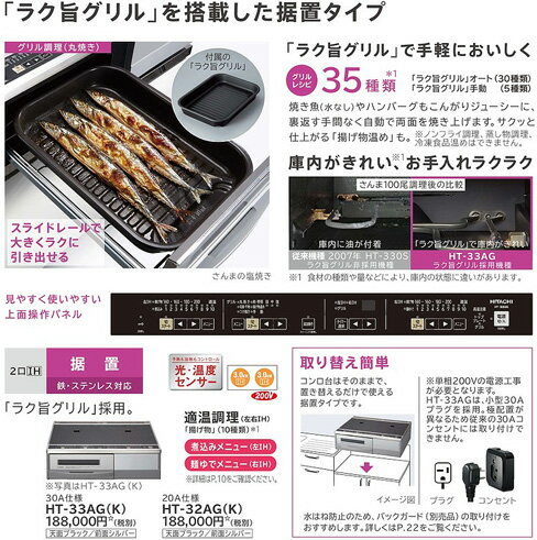 【送料無料】日立 IHクッキングヒーター 据置 59cm 2口IH ブラック/シルバー 鉄・ステンレス対応 20A 単相200V ラク旨グリル付属 HT-32AG(K)