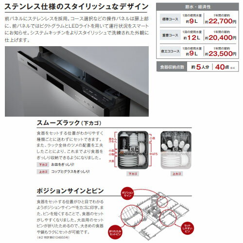 【セット内容】 ・本体 【ドアパネル型について】 ドアパネル型の商品は化粧パネルなしの素地でもご使用頂けます。 化粧パネル無しでご使用いただくか、別売の化粧パネルなどをご用意ください。 ※イメージ画像は別売パネルをセットしている場合がございます。 また、形状によっては既設の化粧パネルを転用できない場合もあります。 システムキッチンの化粧パネル(別売品)との組み合せなどご不明な点は、お気軽にご相談下さい。 【規格・特徴】 ・標準使用水量:9L(標準コース) ・1回あたり標準運転経費:26.1円(標準コース) ・食器収納点数:約5人用(40点) ・運転コース:標準、重曹、念入り、少量、洗浄のみ、夜エコ、乾燥、クリーンキープ、庫内洗浄 ・外形寸法(mm):高さ450×幅448×奥行616.5 ・質量(kg):約19 ・使用電源:AC100V 50/60Hz共用 ・給水方式:給水・給湯兼用(給湯は70度以下) ・洗浄方式:回転ノズル噴射による加熱洗浄方式 ・乾燥方式:ヒーター間欠通電+強制送風 ・温度制御方式:サーミスタによる制御 ・水位検知:水位スイッチによるマイコン制御 ・給排水ホースの長さ(mm):給水950/排水975 ・運転音:標準コース40dB(50Hz)/42dB(60Hz) 【本体カラー】 ・ステンレス 【機能】 ・プラズマクラスター ・重曹コース ・スマッシュ洗浄ノズル ・バイタル除菌洗浄 ・スムーズラック ・折りたたみサークルラック ・ポジションサイン ・ぎっしりカゴ ・夜エココース ・スリムラインフェイス ・銀イオンカートリッジ付属 ・オールトップコントロール ・クイックスタート機能 ・庫内洗浄コース ・運転行程お知らせランプ ・予約運転 ・からっとキープ ・ソフト排気 ・ワンタッチドア ・化粧パネル対応(※別途ご用意下さい) 【商品説明】 多彩な洗浄コースを搭載 大容量でも、少量の洗浄も可能な標準シリーズのミドルグレードモデル 買い替え対応商品です。 【大型商品の配送について】 ■基本ドライバー1人で訪問の為、荷下ろしの際にお手伝いできる方が必要となります。 ■時間指定が出来かねます。 詳細の配送状況につきましては、直接運送会社へご確認お願い申し上げます。 不在時は、不在票が投函されますので、お客様にて再配達のお手続きをお願い申し上げます。 2022年12月1日発売 食器洗 食洗機 食器洗乾燥機 タワーウォッシャー サークルラック スチーム洗浄 銀イオンカートリッジ 重曹洗浄 プラズマクラスター スマート液晶ナビ ドアパネル型 ミドルグレード 重曹 食器洗い乾燥機 食器洗乾燥機リンナイRKW-405GP