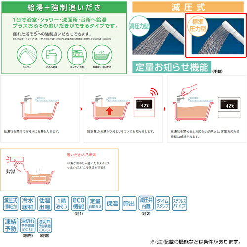 【セット内容】 (1)KIB-3867FG ・本体 ・油ゴムホース ・送油管接続パイプ ・うす型給排気筒セット(FF-70-092) (2)KR-112V ・音声リモコンセット(台所・浴室リモコン) ※屋外オイルタンクと直接接続される場合は油銅パイプ両フレア付が別途必要です。 ※ゴム製の送油管は屋外では使用禁止。 ※リモコンコード、配管部材、油タンク等は別売です。 【規格・特徴】 ・給湯+強制追いだき 定量お知らせタイプ(手動) ・3万キロ ・給湯:37.8kW(32,500kcal/h) ・屋内据置型(強制給排気FFタイプ) ・減圧式 標準圧力型 ・本体寸法:H866×W256×D515(mm) ・外装塗装鋼板 ・減圧弁内蔵 ・給排気延長 3m3曲がりまで ※給気側延長は、φ70ステンレス管を使用。 【別売部材】 リモコンコード台所リモコン用 RK-3P-5M リモコンコード浴室リモコン用 KFR-3P-5M リモコンパイプセット RPS-1 音声リモコンセット KR-112V 増設リモコン CMR-3310SV 増設リモコン CMR-2801S バックアップ電源ユニット BDU-303 油タンク82L SOT-901 油タンク82L OT-90U 油銅パイプ両フレア付 800231 ※その他専用の排気筒などもございます。 【商品説明】 「給湯+強制追いだきタイプ」は、1台で浴室・シャワー・洗面所・台所へ給湯プラスおふろの追いだきができるタイプです。 「定量お知らせ機能」はお湯はり完了をリモコンの音声またはブザーでお知らせ。 お湯が冷めたら、スイッチポンで「追いだき」「ふろ保温」が可能です。 「減圧式」は、水道の圧力を抑えてお湯をお届けするタイプ。「一般的なお湯の勢いで充分」という方におすすめです。 【長期使用製品安全点検制度について】 長期使用製品安全点検制度とは、長期間の使用に伴い生ずる劣化(経年劣化)により安全上支障が生じ、 一般消費者の生命又は身体に対して特に重大な危害を及ぼすおそれが多い「特定保守製品」について、 所有者の登録や有償での点検等を支援する制度として平成21年4月よりスタートしたものです。 商品に同梱の所有者票に、ご記入の上メーカーへご返送いただくか、インターネットより、所有者情報のご登録をお願いいたします。 【大型商品の配送について】 ■基本ドライバー1人で訪問の為、荷下ろしの際にお手伝いできる方が必要となります。 ■時間指定が出来かねます。 詳細の配送状況につきましては、直接運送会社へご確認お願い申し上げます。 不在時は、不在票が投函されますので、お客様にて再配達のお手続きをお願い申し上げます。 長府 石油給湯機 石油ふろ給湯機 ちょうふ 定量お知らせ FF用給排気筒 FF-70-092 FF式 薄型給排気筒付 2023年10月CHOFUKIB-3867FG-set