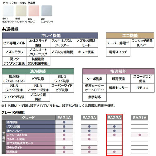 【規格・特徴】 ・瞬間式(連続出湯) ・大型共用サイズ ・寸法:W413mm×D541mm×H104mm ・手動ハンドル式 ・電源:AC100V ・コード長さ:1.0m [グレード別機能:EA22A] ・ノズル除菌 ・鉢内スプレー ・エアシールド脱臭 ・温風乾燥 [共通機能] ■キレイ機能 ・ビデ専用ノズル ・本体スライド着脱 ・スッキリノズルシャッター ・ノズルお掃除モード ・ノズルそうじ ・ノズルオートクリーニング ・ノズル先端着脱 ・キレイ便座 ・便フタワンタッチ着脱 ・抗菌樹脂 ■エコ機能 ・スーパー節電 ・ワンタッチ節電(8h) ・電源スイッチ ■洗浄機能 ・おしり洗浄(パワフル/マイルド) ・ビデ洗浄 ・おしりワイド洗浄 ・おしりワイドS洗浄 ・おしりマッサージ洗浄 ・スーパーワイドビデ洗浄 ・ワイドビデ洗浄 ・ノズル位置調節 ■快適機能 ・ターボ脱臭 ・暖房便座 ・スローダウン便座 ・便座ヒーターオートOFF ・着座センサー ・リモコン ・点字対応 【カラー】 ・ピュアホワイト(BW1) ・オフホワイト(BN8) ・ピンク(LR8) ・ブルーグレー(BB7) 【納期について】 ピンク(LR8)、ブルーグレー(BB7)は受注生産品です。納期は約1週間かかります。 【商品説明】 便器鉢内に気流を発生、循環させて鉢内を脱臭。 においの上昇を気流がキャッチし吸い込むことで、トイレ空間を快適に保ちます。 便器自動洗浄機能はありません。 【メーカー直送便の注意事項】 下記の条件がございますので、商品によってはご準備くださいますようお願い致します。 ※別途金額が発生する場合がありますので必ずご一読ください。 ■商品お渡しについて 基本ドライバー1人で訪問の為、荷下ろしの際にお手伝いできる方が必要となります。 集合住宅の場合は1階及びエントランス、戸建住宅の場合は玄関先でのお引き渡しとなります。 ■配送車について 一般的な宅配業者でございません。メーカー指定の大型トラック(4t車)にての配送となります。 道幅6m(一般的な軽自動車がすれ違える道幅)以下の場合、配達ができません。 別途追加料金が発生いたしますが、2tトラックでの手配が可能です。 階段、狭所など困難な場合はご相談ください。 ■商品お届け日について メーカーに在庫があり、日にち指定がない場合は、翌日、または翌々日のお届けとなります。ご希望日がありましたらご注文フォームの「お届け日時」にご記入ください。(平日のみ) 納期要確認の記載のある商品や受注生産商品の場合、納期にお時間が掛かります。詳細な納期については商品により異なりますので、改めて当店よりご連絡させて頂きます。 ■お届け時間について 時間指定が出来かねます。必ず連絡が取れる電話番号と荷受人のお名前を記載ください。 当日の配送時間(目安)については、配送前にドライバーよりご連絡させて頂きます。 (配送前連絡はサービスとなりますので確約するものではございません) ■不在時の再配達について 不在の場合は運送会社が持ち帰り、当日の再配達が出来かねます。 また保管料・再配達の手数料が発生する場合(お客様負担)がございますのでお届け日には必ずご在宅いただけますようお願い致します。 ■配送エリアについて 沖縄・離島地域の場合、別途費用がかかる場合がございます。 ■お支払い方法について 「後払い」「クレジットカード」「銀行振込」「郵便振替」のみとなります(代金引換は不可)。 ご入金確認後にメーカーへ発注させていただきます。 NewPASSO 温水洗浄便座 シャワートイレ 大型共用 おしり洗浄 暖房洗浄便座 エアシールド脱臭 手動ハンドル式 2024年4月LIXIL洗浄便座LIXILCW-EA22A