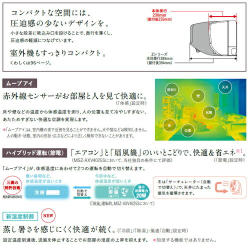 【セット内容】 (1)MSZ-AXV5625S-W-IN ・室内機 (2)MUZ-AXV5625S ・室外機 (3)リモコン ※リモコンホルダーは別売です。 【規格・特徴】 ・冷房能力:5.6kW ・暖房能力:6.7kW ・室内電源タイプ:200V ・室内機サイズ(mm):高さ295×幅799×奥行230(据付後235) ・室外機サイズ(mm):高さ550×幅800(+62)×奥行285(+60) ※( )内は突起物の寸法です。 ・新冷媒R32 ・日本製(付属品の一部は除く) ・2025年モデル 【カラー】 ・ピュアホワイト(W) 【機能】 「センサー」 ・赤外線センサー(ムーブアイ) 「省エネ」 ・ハイブリット運転 ・消し忘れ防止 「暖房」 ・室温キープシステム 「冷房・除湿」 ・STRONG冷房 ・スマート除湿 「気流」 ・保湿風よけ ・ワイド気流/ロング気流:150度/10m ・ハイパワー 「空気をキレイに」 ・空清フィルター(プラチナアレル除菌空清フィルター) ・PM2.5への対応(帯電ミクロフィルター)(別売) 「清潔」 ・エアフィルター(清潔Vフィルター:防カビ/ウイルス抑制) ・よごれんボディ(ファンのみ) ・清潔コート熱交換器 ・おまかせボディ(内部クリーンlight・スタート脱臭) ・はずせるボディ 「便利・安心」 ・高温みまもり ・みまもり快眠 ・MyMUアプリ(無線LAN別売):おかえりON/おでかけOFF 「タイマー」 ・バックライト ・時刻で予約 ・かんたん予約(切タイマーのみ) 「その他」 ・室外機凍結防止ヒーター(※取付不可※) ・停電自動復帰(別途工事) ・JRA耐塩害仕様準拠(外装塗装部品のみ) 【商品説明】 寝室や子ども部屋などの小部屋にちょうどいいエアコン。 【メーカー直送便の注意事項】 下記の条件がございますので、商品によってはご準備くださいますようお願い致します。 ※別途金額が発生する場合がありますので必ずご一読ください。 ■商品お渡しについて 基本ドライバー1人で訪問の為、荷下ろしの際にお手伝いできる方が必要となります。 集合住宅の場合は1階及びエントランス、戸建住宅の場合は玄関先でのお引き渡しとなります。 ■配送車について 一般的な宅配業者でございません。メーカー指定の大型トラック(4t車)にての配送となります。 道幅6m(一般的な軽自動車がすれ違える道幅)以下の場合、配達ができません。 別途追加料金が発生いたしますが、2tトラックでの手配が可能です。 階段、狭所など困難な場合はご相談ください。 ■商品お届け日について メーカーに在庫があり、日にち指定がない場合は、翌日、または翌々日のお届けとなります。ご希望日がありましたらご注文フォームの「お届け日時」にご記入ください。(平日のみ) 納期要確認の記載のある商品や受注生産商品の場合、納期にお時間が掛かります。詳細な納期については商品により異なりますので、改めて当店よりご連絡させて頂きます。 ■お届け時間について 時間指定が出来かねます。必ず連絡が取れる電話番号と荷受人のお名前を記載ください。 当日の配送時間(目安)については、配送前にドライバーよりご連絡させて頂きます。 (配送前連絡はサービスとなりますので確約するものではございません) ■不在時の再配達について 不在の場合は運送会社が持ち帰り、当日の再配達が出来かねます。 また保管料・再配達の手数料が発生する場合(お客様負担)がございますのでお届け日には必ずご在宅いただけますようお願い致します。 ■配送エリアについて 沖縄・離島地域の場合、別途費用がかかる場合がございます。 ■お支払い方法について 「後払い」「クレジットカード」「銀行振込」「郵便振替」のみとなります(代金引換は不可)。 ご入金確認後にメーカーへ発注させていただきます。 【大型商品の配送について】 ■基本ドライバー1人で訪問の為、荷下ろしの際にお手伝いできる方が必要となります。 ■大型トラック(4t車)にて配送となります。 道幅6m(一般的な軽自動車がすれ違える道幅)以下の場合、配達ができません。 ※別途追加料金が発生いたしますが、2tトラックでの手配が可能です。 階段、狭所など困難な場合はご相談ください。 ■時間指定が出来かねます。 その為、必ず連絡が取れる電話番号と荷受人の名前を記載ください。 当日の配送時間(目安)については、配送前にドライバーよりご連絡させて頂きます。 2025年モデル 3月 ムーブアイ ハイブリット アルミサビナイト三菱電機MSZ-AXV5625S-W