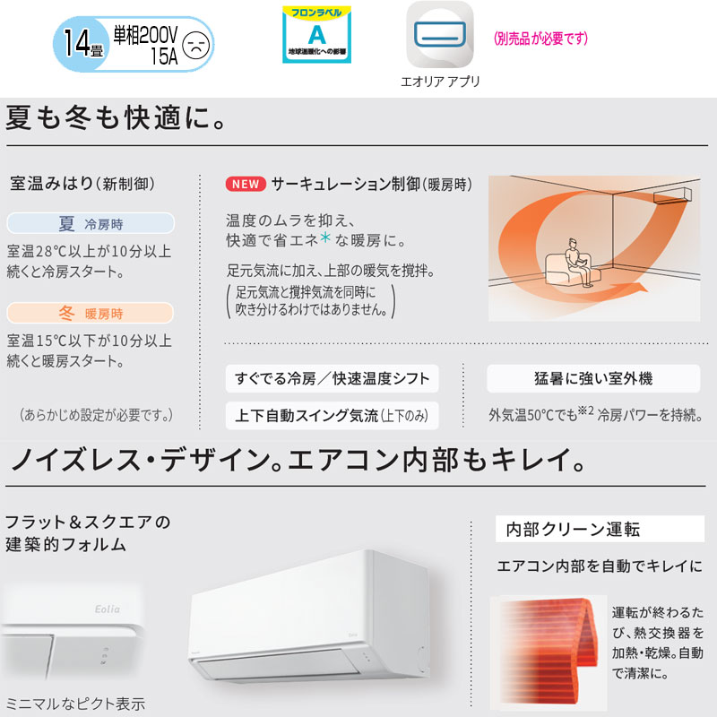 【セット内容】 (1)CS-406DFL2-W ・室内機 (2)CU-406DFL2 ・室外機 【規格・特徴】 ・冷房能力:4.0kW ・暖房能力:5.0kW ・室内電源タイプ:200V ・室内機サイズ(mm):高さ290×幅780×奥行229 ・室外機サイズ(mm):高さ551×幅780(A68 B20.5)×奥行289(C39 D31.5) ※Aバルブカバー B取っ手部 C前面:吹き出しグリル D背面:脚部 ・2026年モデル ・R32新冷媒 【注意】 ※室内機の据え付け位置を決める際には、上下風向フラップの可動スペースが確保できているかをご確認ください。 【カラー】 ・クリスタルホワイト(-W) 【機能】 「清潔」 ・内部クリーン(冷房時) ・熱交換器コーティング(親水) ・エアフィルター ・空気清浄フィルター(別売) 「冷房」 ・制御(快速温度シフト) ・すぐでる冷房 ・天井気流 ・1/fゆらぎ 「暖房」 ・気流、制御(サーキュレーションモード) 「冷房・暖房」 ・気流他(上下自動(上下のみ)) 「除湿」 ・冷房除湿 「タイマー」 ・タイマー(入切) 「便利」 ・室温みはり(新制御) 「その他」 ・室外機仕様(50度対応) 「IoT」 ・エオリアアプリ(無線LAN別売) 【商品説明】 スタンダードモデル 【メーカー直送便の注意事項】 下記の条件がございますので、商品によってはご準備くださいますようお願い致します。 ※別途金額が発生する場合がありますので必ずご一読ください。 ■商品お渡しについて 基本ドライバー1人で訪問の為、荷下ろしの際にお手伝いできる方が必要となります。 集合住宅の場合は1階及びエントランス、戸建住宅の場合は玄関先でのお引き渡しとなります。 ■配送車について 一般的な宅配業者でございません。メーカー指定の大型トラック(4t車)にての配送となります。 道幅6m(一般的な軽自動車がすれ違える道幅)以下の場合、配達ができません。 別途追加料金が発生いたしますが、2tトラックでの手配が可能です。 階段、狭所など困難な場合はご相談ください。 ■商品お届け日について メーカーに在庫があり、日にち指定がない場合は、翌日、または翌々日のお届けとなります。ご希望日がありましたらご注文フォームの「お届け日時」にご記入ください。(平日のみ) 納期要確認の記載のある商品や受注生産商品の場合、納期にお時間が掛かります。詳細な納期については商品により異なりますので、改めて当店よりご連絡させて頂きます。 ■お届け時間について 時間指定が出来かねます。必ず連絡が取れる電話番号と荷受人のお名前を記載ください。 当日の配送時間(目安)については、配送前にドライバーよりご連絡させて頂きます。 (配送前連絡はサービスとなりますので確約するものではございません) ■不在時の再配達について 不在の場合は運送会社が持ち帰り、当日の再配達が出来かねます。 また保管料・再配達の手数料が発生する場合(お客様負担)がございますのでお届け日には必ずご在宅いただけますようお願い致します。 ■配送エリアについて 沖縄・離島地域の場合、別途費用がかかる場合がございます。 ■お支払い方法について 「後払い」「クレジットカード」「銀行振込」「郵便振替」のみとなります(代金引換は不可)。 ご入金確認後にメーカーへ発注させていただきます。 【大型商品の配送について】 ■基本ドライバー1人で訪問の為、荷下ろしの際にお手伝いできる方が必要となります。 ■大型トラック(4t車)にて配送となります。 道幅6m(一般的な軽自動車がすれ違える道幅)以下の場合、配達ができません。 ※別途追加料金が発生いたしますが、2tトラックでの手配が可能です。 階段、狭所など困難な場合はご相談ください。 ■時間指定が出来かねます。 その為、必ず連絡が取れる電話番号と荷受人の名前を記載ください。 当日の配送時間(目安)については、配送前にドライバーよりご連絡させて頂きます。 スタンダードモデル 2026年1月パナソニックエアコンパナソニックXCS-406DFL2-W
