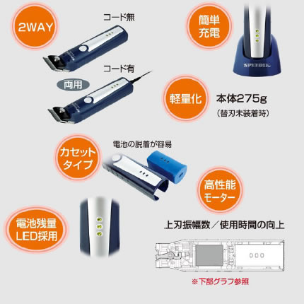 軽くて、パワフルなクリッパーが新登場しました。 新発売のピースは同じスピーディックシリーズの「タピオ」よりパワフルで、「レガート」より軽量なクリッパーです。 コード、コードレス両用ができ、最高の切れ味と操作性を兼備しております。 コードを接続しての使用と電池パック(コードレス)の使用を併用することにより、長時間の使用が可能です。 電池はリチウムイオンを採用しておりご使用都度の継足し充電ができます。 本体の重さは275g(替刃未装着時)と軽量。細身で持ちやすく、滑りにくい形状なので、手に優しくフィットしカットの手助けをします。 スイッチはケース上部に。 押しボタン方式の採用により繰り返し操作が簡単になりました。 電池は脱着や交換が瞬時にできる簡単なカセット方式を採用しております。 電池残量がインジケーター機能(LED)の採用によりひと目でわかります。 ●サイズ:L177mm、W37mm ●カラー:メタリックブルー(一部シルバー) ●電源:AC100-240V50/60Hz ●充電時間:約150分(完全放電時) ●電源コード:1.5m ●連続使用可能時間:約60分 【スピーディク製品の保証書について】 保証書はついておりません。 業務用としてお使いいただく方、家庭用としてお使いいただく方が両方おられますので、使用時間が大幅に異なります。 そのため、日数での判断は難しく、スピーディク社の修理担当者が消耗部品の磨耗の仕方により判断させていただいております。
