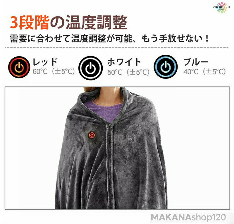 ご注意:バッテリーは付属しておりません。別途にご購入する必要がございます。【ふんわり手触り】ふんわり起毛の素材を採用し、柔らかい風合いで、体がぬくもりが感じられます。寒い冬場の就寝時や仕事時も快適になります。【3段階温度調節】温度は赤いモード(±60℃)とホワイトモード(±50℃)とブルーモード(±40℃)があります。3モードに自由に切り替えられます。特に寒がりの女性におすすめです。【ヒーター板は均等に設置される】毛布にヒーター板は均等に設置されて、usb接続すると電気毛布の機能が作動します。すぐに温まります。着り方によって、背中、腰、膝を温められます。【丸洗える】汚れたら、40℃以下の水で中性洗剤を使用して軽く手で洗えます。衛生面も安心できます。私たちの製品に注目していただきありがとうございます。優れたサービスはお客様を失望させません。