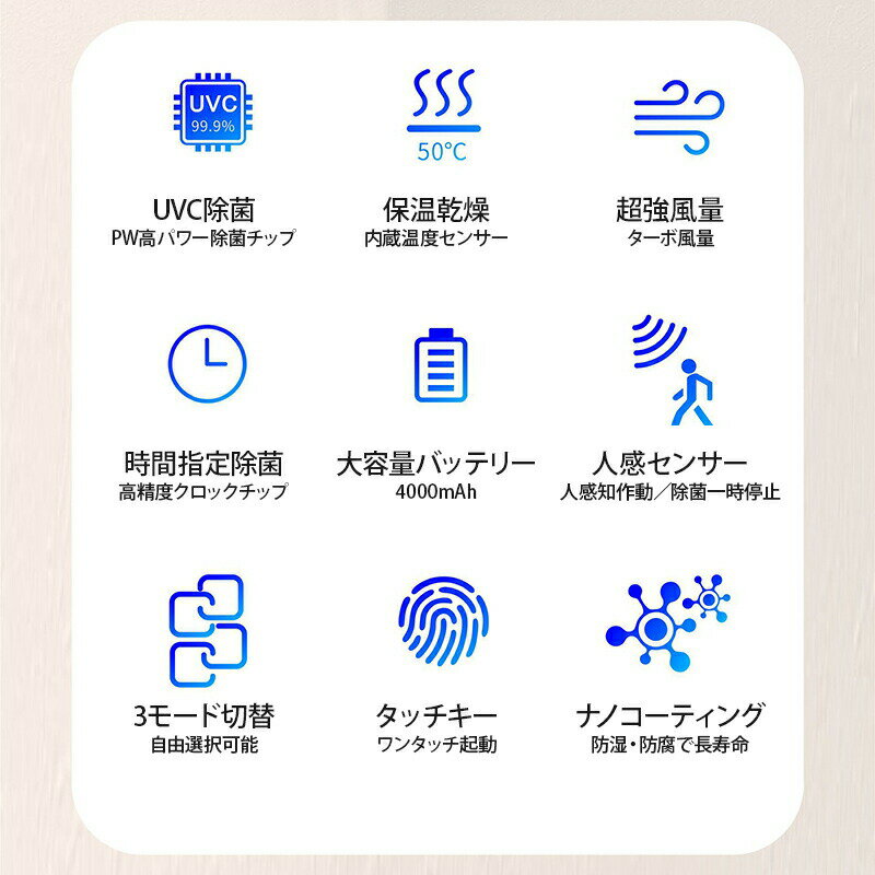 【深紫外線UV-C LED除菌システム】254nmの波長で強力除菌を実現し、歯ブラシの雑菌を細胞レベルで除去します。現役歯科医師監修の信頼できる設計です。【簡単取付と便利な時計機能】強力両面テープで壁に穴を開ける必要がなく、スタイリッシュな収納デザインと便利な時計表示機能を搭載しています。【除菌&乾燥のダブル機能】除菌3分+乾燥8分の徹底ケアで、デジタル残時間表示付き。UVCライトとファンによる効果的な除菌システムです。【3モード切替&便利な自動除菌システム】通常(180秒除菌+8分乾燥) / 強力(360秒除菌+30分乾燥) / 自動 1日4回(6時、7時、21時、22時)の定期的な自動除菌で、いつでも清潔な歯ブラシをご使用いただけます。【人感センサー】人が近づくと自動停止→ディスプレイ点灯。紫外線曝露リスクを完全遮断。【ターボ乾燥+保温機能】寒い冬も50℃恒温維持(NTCスマート温度制御)カビの原因となる湿気を強力排除【分離式洗浄設計】カップ本体丸洗い可能歯ブラシを徹底的に清潔に保ち、嫌な臭いを解消することで、ご家庭はもちろん、出張や旅行、キャンプなどの持ち運びや学校、会社の昼食後に最適なアイテムとしておすすめします。清潔さを保ちながら心地よい口当たりを提供し、いつでも爽快な口元を実現します。美しいデザインと便利な持ち運び性が、日常生活に一層の快適さをもたらします。関連キーワード歯ブラシ 除菌 歯ブラシケース 除菌ケース 除菌器 ファン 歯ブラシ除菌器 カビ防止 梅雨対策【深紫外線UV-C LED除菌システム】254nmの波長で強力除菌を実現し、歯ブラシの雑菌を細胞レベルで除去します。現役歯科医師監修の信頼できる設計です。【簡単取付と便利な時計機能】強力両面テープで壁に穴を開ける必要がなく、スタイリッシュな収納デザインと便利な時計表示機能を搭載しています。【除菌&乾燥のダブル機能】除菌3分+乾燥8分の徹底ケアで、デジタル残時間表示付き。UVCライトとファンによる効果的な除菌システムです。【3モード切替&便利な自動除菌システム】通常(180秒除菌+8分乾燥) / 強力(360秒除菌+30分乾燥) / 自動 1日4回(6時、7時、21時、22時)の定期的な自動除菌で、いつでも清潔な歯ブラシをご使用いただけます。【人感センサー】人が近づくと自動停止→ディスプレイ点灯。紫外線曝露リスクを完全遮断。【ターボ乾燥+保温機能】寒い冬も50℃恒温維持(NTCスマート温度制御)カビの原因となる湿気を強力排除【分離式洗浄設計】カップ本体丸洗い可能歯ブラシを徹底的に清潔に保ち、嫌な臭いを解消することで、ご家庭はもちろん、出張や旅行、キャンプなどの持ち運びや学校、会社の昼食後に最適なアイテムとしておすすめします。清潔さを保ちながら心地よい口当たりを提供し、いつでも爽快な口元を実現します。美しいデザインと便利な持ち運び性が、日常生活に一層の快適さをもたらします。関連キーワード歯ブラシ 除菌 歯ブラシケース 除菌ケース 除菌器 ファン 歯ブラシ除菌器 カビ防止 梅雨対策
