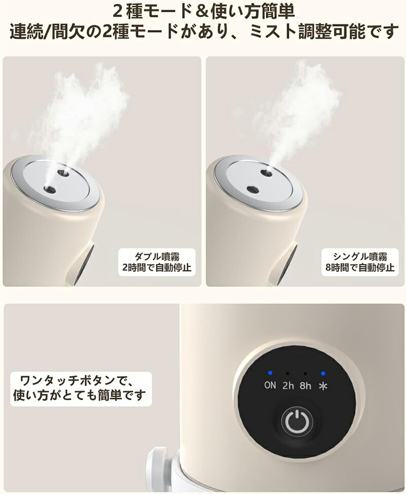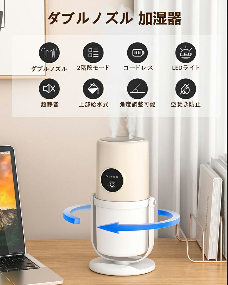 商品情報梱包サイズ20.3 x 10.3 x 10.2 cm素材ABSワット数(W)3Wその他 機能タンク取り外し可能, ナイトライト, タイマー, 漏れ防止, 超音波技術電圧(V)5ボルト電池種別リチウムイオン梱包重量0.49キログラムこの商品について【1800mAh大容量&360°角度調整可能】旧型よりバッテリー容量が60%アップ(720mAh→1800mAh)された小型加湿器のバッテリー持続時間が2倍に! 一回フル充電して最大8H*のコードレス使用ができます。加湿器をペースに固定すると、360度回転させることができます。また、加湿器の上部は上下に調整可能です。お好みに合わせて加湿の方向を調整し、お客様に快適な室内環境をカスタマイズする機会を提供いたします。 【超静音&持ち運びに便利&3階段加湿モード】かしつきの動作音は25dB以下、とても静かで図書館よりも静かで、周りの湿度を保ちながら、仕事や睡眠の邪魔にならない卓上加湿器 です。Type-C充電式はコンピューターやモバイルバッテリーなどから電源を取れて、軽量かつパーソナルサイズで、オフィス、書斎などの卓上に、寝室のベッドサイドに、車内にも適します。どこでも使えるし、携帯には便利です。2時間/4時間/8時間・3種モードがあり、加湿量調整可能です。 【七色LEDライト&アロマ対応】7色の変化するLEDライトはベッドサイドで夜間照明として役に立ちます。水溶性アロマにも対応可能、数滴だけ入れて、一日の疲れた体を癒してくれます。ご注意:水溶性アルマオイルしか入れることができません。普通のアロマオイルは油なので水と混ざらず、タンクの中に入れると油膜ができてカビや雑菌、劣化の原因となってしまいます。 【上部給水式&空焚き防止機能】加湿器は上から注水タイプなので、蓋を開けるだけで楽々注水でき、お手入れも簡単にできます(ぜひ普通の水道水を入れてください)。ワンタッチボタンの設計でだれでも簡単に使用できます。水がなくなると自動的に運転を停止する空焚き防止機能が搭載され、持続噴霧モードは最大4時間で自動的に停電し、間欠噴霧モードは8時間で自動的に停電し、お子供やお年寄りがいる家庭でも安心してご使用いただけます。