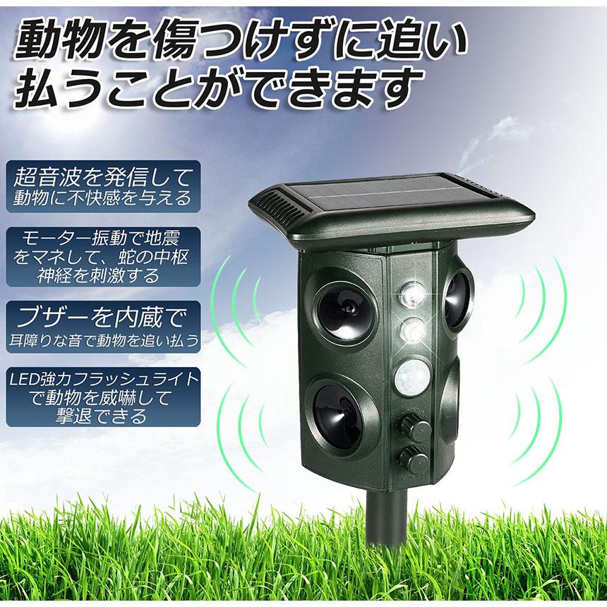 【センサー感知範囲3-11m調整可能・対応性が優れ】赤外線自動感知センサー範囲:左右角度180°、上下角度60°、直進最長10m、広さは約200m2までカバー可能です。(動物のボリュームによって、感知範囲が違います)わずか1-2週間ぐらいで動物の糞尿、食害、騒音、足跡などの悩みから解放されます。「空き巣対策」防犯用品として利用可能で、音・ライトで不審者を驚かせ、キャンプ場害獣撃退にも利用可能です。【4個の超音波スピーカー・機械波発振・5つのモード設置】超音波+強力LEDフラッシュライト+機械波発振(模擬耐震機能)+自動混合モード(1ー2ー3ー4モードを繰り返します)、高効率的に動物撃退できます。4個の超音波スピーカー付きで、動物撃退の有効範囲が300m2になり、対応動物種類も増えております。超音波の周波数とセンサー感度が調節でき、また超音波発振周波数は各都度によって自動的に変動し、動物の慣れを防ぎます。弊社の動物撃退器は人体、環境に悪影響が与えないので、ご安心使用いただけます。【センサー感知範囲3-11m調整可能・対応性が優れ】赤外線自動感知センサー範囲:左右角度180°、上下角度60°、直進最長10m、広さは約200m2までカバー可能です。(動物のボリュームによって、感知範囲が違います)わずか1-2週間ぐらいで動物の糞尿、食害、騒音、足跡などの悩みから解放されます。「空き巣対策」防犯用品として利用可能で、音・ライトで不審者を驚かせ、キャンプ場害獣撃退にも利用可能です。【4個の超音波スピーカー・機械波発振・5つのモード設置】超音波+強力LEDフラッシュライト+機械波発振(模擬耐震機能)+自動混合モード(1ー2ー3ー4モードを繰り返します)、高効率的に動物撃退できます。4個の超音波スピーカー付きで、動物撃退の有効範囲が300m2になり、対応動物種類も増えております。超音波の周波数とセンサー感度が調節でき、また超音波発振周波数は各都度によって自動的に変動し、動物の慣れを防ぎます。弊社の動物撃退器は人体、環境に悪影響が与えないので、ご安心使用いただけます。