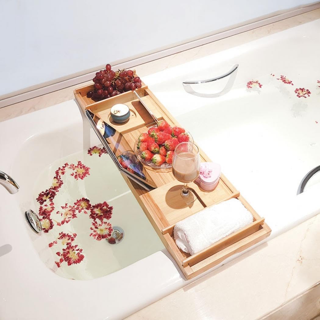 バスタブトレー バスタブラック 竹製 バブル浴置き台 バスグッズ 浴槽置き台 小物置き多機能 お風呂ラック お風呂テーブル 浴槽収納ラック 便利グッズ 収納便利 調整可能 伸縮性 お風呂用 浴槽用 バ