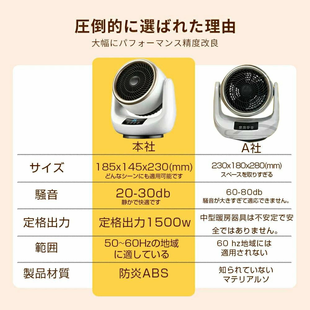 商品情報 【すぐに暖かい】 この冬、在宅時間を快適に過ごす!スイッチを入れればすぐに温風が出るため、立ち上がりを待たずに暖まることができます。テーブルやデスクの上に乗せて指先の冷えやかじかみに温かい風を。冷えを感じやすい足元に設置するとより温かさを実感できます。 【60度首振り機能】 60度左右自動首振り機能が付いているので、本体を移動させなくても広範囲をしっかり暖めてくれます。 【無臭】 ガスや石油などの化石燃料を燃やさないので、暖房特有の嫌な臭いがしません。 製品寸法:18.5*14.5*23cm パッケージサイズ:20*17.5*23.5cm 製品重量:1050g 素材:難燃性ABS、難燃性ナイロン、PP 定格電圧:110V 製品周波数:50Hz、60Hz 温度調整:3段階 【適応場所】 店舗 ヘアサロン 美容室 理髪店 飲食店 居酒屋 レストラン カフェ バル バー ダイニングバー ホテル モデルハウス 喫茶店 ビジネスホテル 食堂 エステティックサロン ネイルサロン アパレルショップ 本屋 美術館 博物館 雑貨ショップ セレクトショップ インテリアショップ ヒーリングサロン コーヒーショップ 【こんなシーンにぴったり】 おしゃれ エコ オシャレ 一人暮らし パーティ ホームパーティ 間接照明 インスタ映え インスタ おうちごはん おうちご飯 おうちカフェ シンプルライフ シンプルな暮らし 丁寧な暮らし 家族団らん 家族団欒 バースデー ハロウィン クリスマス 女子会 新生活 朝食 昼食 夕飯 豊かな食卓 子供のいる暮らし リラックスタイム マイホーム計画中 趣味部屋 雰囲気のある暮らし