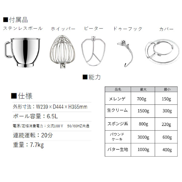 ※この商品はメーカー直送の為、代金引換及びお届け時間帯指定はできません。予めご了承ください。 ※発送先が沖縄・北海道・離島の場合、別途送料【区分B】がかかります。ご注意ください。 ※こちらの商品は【法人販売限定】のため、送り先または・宛名に法人名をお入れください。 サイズ:W239×D444×H365mm(ボウル含む) 重量:7.7Kg 電源:交流100V 50/60HZ共通 生産国:中国 保証期間:1年 革新的な精巧なデザインステンレススチール304ボウル。 LEDデイスプレイとタイマー機能 5秒単位 最大20分まで設定可能。 10段階の速度調整可能 ※作動中に速度を調整することも出来ます。 優れた安全機能:滑り止め脚で最大限の安定性を実現、過負荷およ過熱保護。 ※ピザ・パンなど硬い生地の使用は非推奨。