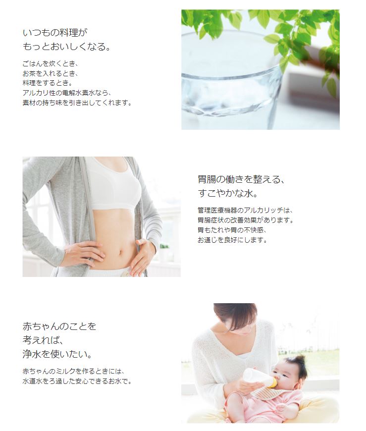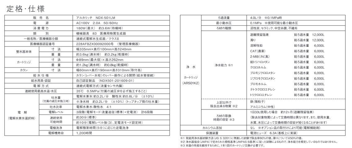 メーカー OSGコーポレーション 商品名/仕様 ・アルカリッチ NDX-501LM ・医療機器認証番号:第228AFBZX00092000号 <管理医療機器> ・一般的名称:連続式電解水生成器/クラス2 《本体》 ・寸法(mm):幅335mm×奥行100mm×高240mm ・重量(Kg):約3.6kg(満水時) 約3.2kg(乾燥時) ・カラン:寸法:幅60mm×奥行190mm×取付高310mm(取付高) ・給水仕様:カラン(レバー水栓)のレバー操作による開閉(給水管接続) ・電解方式:連続式電解方式(流量センサ内蔵) ・連続使用最高水温:35℃ ・連続使用最高水圧:0.5MPa 《電解(電解水素水選択時)》 ・吐水量:電解水素水:約3.2L/分、酸性水:約0.8L/分 (±10%) ※浄水時 約3.2L/分 (±10%) (トップタップ側の吐水量) ・吐水比率:電解水素水:酸性水 4:1 ・電解レベル:3段階(電解モード:流量追従(標準)+定電流) 計6段階 ・連続使用可能時間:約30分(標準)/約10分(電解レベル強(3)、定電流モード設定時) ・電極洗浄方式:電解積算時間(5分)に応じた逆電洗浄 ・ろ過流量(0.1MPa時):4.0L/分 ・使用可能な最小動水圧:0.1MPa 《浄水カートリッジ(AR501K)》 ・ろ材の種類:活性炭、セラミック、中空糸膜、不織布 ・浄水能力(総ろ過流量)※1: 遊離残留塩素総ろ過流量12,000L 濁り総ろ過流量12,000L 溶解性鉛総ろ過流量6,000L CAT(農薬)総ろ過流量6,000L 2-MIB(カビ臭)総ろ過流量6,000L 総トリハロメタン総ろ過流量6,000L クロロホルム総ろ過流量6,000L ブロモジクロロメタン総ろ過流量6,000L ジブロモクロロメタン総ろ過流量6,000L ブロモホルム総ろ過流量6,000L テトラクロロエチレン総ろ過流量6,000L トリクロロエチレン総ろ過流量6,000L ・上記以外で除去できる物質(※注2):鉄(微粒子)・アルミニウム(中性) ・ろ材の取換時期の目安 ※2:1日約33L使用した場合 約12ヶ月(遊離残留塩素基準) ・カルシウム添加:なし ※オプション品の取り付けにより可能(電解補助剤) ・保護装置:電流ヒューズ ※注1:家庭用浄水器試験方法(JIS S 3201)に準拠した試験で除去率80%の値。濁りについては50%の値。 ※注2:浄水器協会(JWPA)で定められた規格基準(JWPAS B基準)に従った試験によるもので、浄水能力を規定しているものではありません。 ※注3:本器の性能を維持するために、1年に1回のカートリッジ交換が必要です。 (NDX-303LMWの後継品)[NDX501LM]