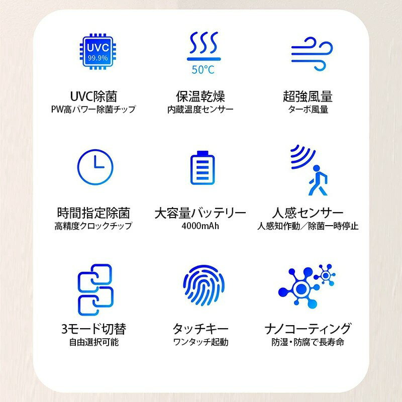 【深紫外線UV-C LED除菌システム】254nmの波長で強力除菌を実現し、歯ブラシの雑菌を細胞レベルで除去します。現役歯科医師監修の信頼できる設計です。 【簡単取付と便利な時計機能】強力両面テープで壁に穴を開ける必要がなく、スタイリッシュな収納デザインと便利な時計表示機能を搭載しています。 【除菌&乾燥のダブル機能】除菌3分+乾燥8分の徹底ケアで、デジタル残時間表示付き。UVCライトとファンによる効果的な除菌システムです。 【3モード切替&便利な自動除菌システム】通常(180秒除菌+8分乾燥) / 強力(360秒除菌+30分乾燥) / 自動1日4回(6時、7時、21時、22時)の定期的な自動除菌で、いつでも清潔な歯ブラシをご使用いただけます。 【人感センサー】人が近づくと自動停止→ディスプレイ点灯。紫外線曝露リスクを完全遮断。 【ターボ乾燥+保温機能】寒い冬も50℃恒温維持(NTCスマート温度制御)カビの原因となる湿気を強力排除 【分離式洗浄設計】カップ・本体丸洗い可能 歯ブラシを徹底的に清潔に保ち、嫌な臭いを解消することで、ご家庭はもちろん、出張や旅行、キャンプなどの持ち運びや学校、会社の昼食後に最適なアイテムとしておすすめします。清潔さを保ちながら心地よい口当たりを提供し、いつでも爽快な口元を実現します。美しいデザインと便利な持ち運び性が、日常生活に一層の快適さをもたらします。 関連キーワード歯ブラシ 除菌 歯ブラシケース 除菌ケース 除菌器 ファン 歯ブラシ除菌器 カビ防止 梅雨対策