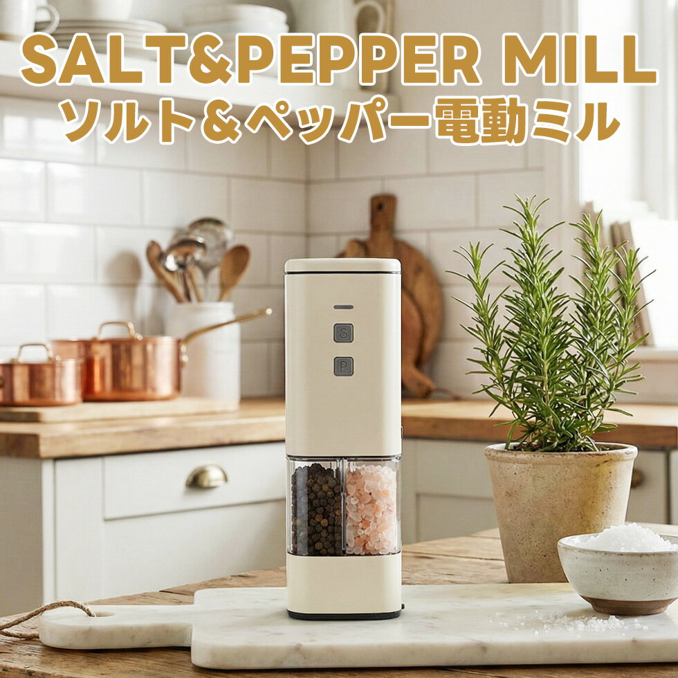 電動ミル ソルト&ペッパー 電動 ペッパーミル 充電式 ミル 一台二役 USB Type-C 片手操作 粗さ調節 スパイスミル 胡椒 塩 コショウ こしょう 調味料 グラインダー すりおろし