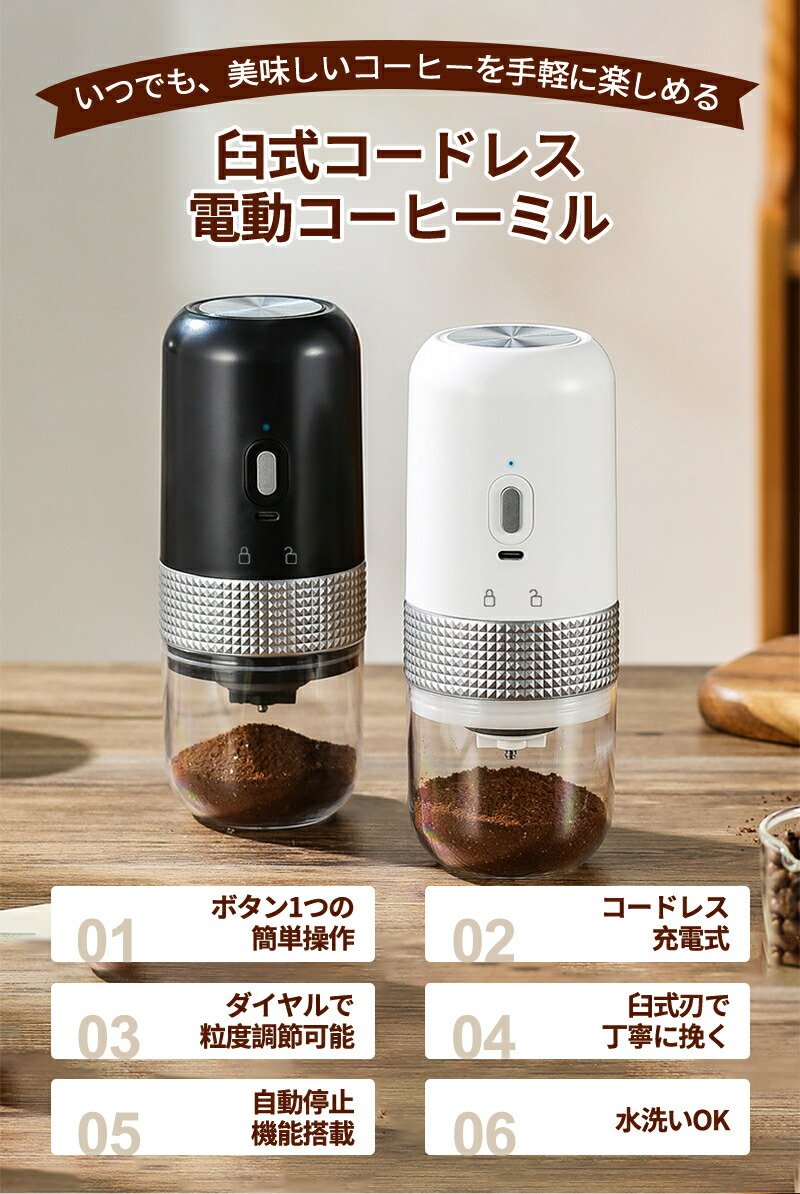 【50%OFFクーポン!先着限定!1/24 20:00~】電動コーヒーミル 臼式コーヒーミル コードレス USB充電式 コーヒーグラインダー 電動ミル 分離式 水洗い可 珈琲ミル 自動停止 コンパクト コニカル式 セラミック刃 豆挽き機 水洗い可 電動コーヒーミル 小型 ミル ポータブル