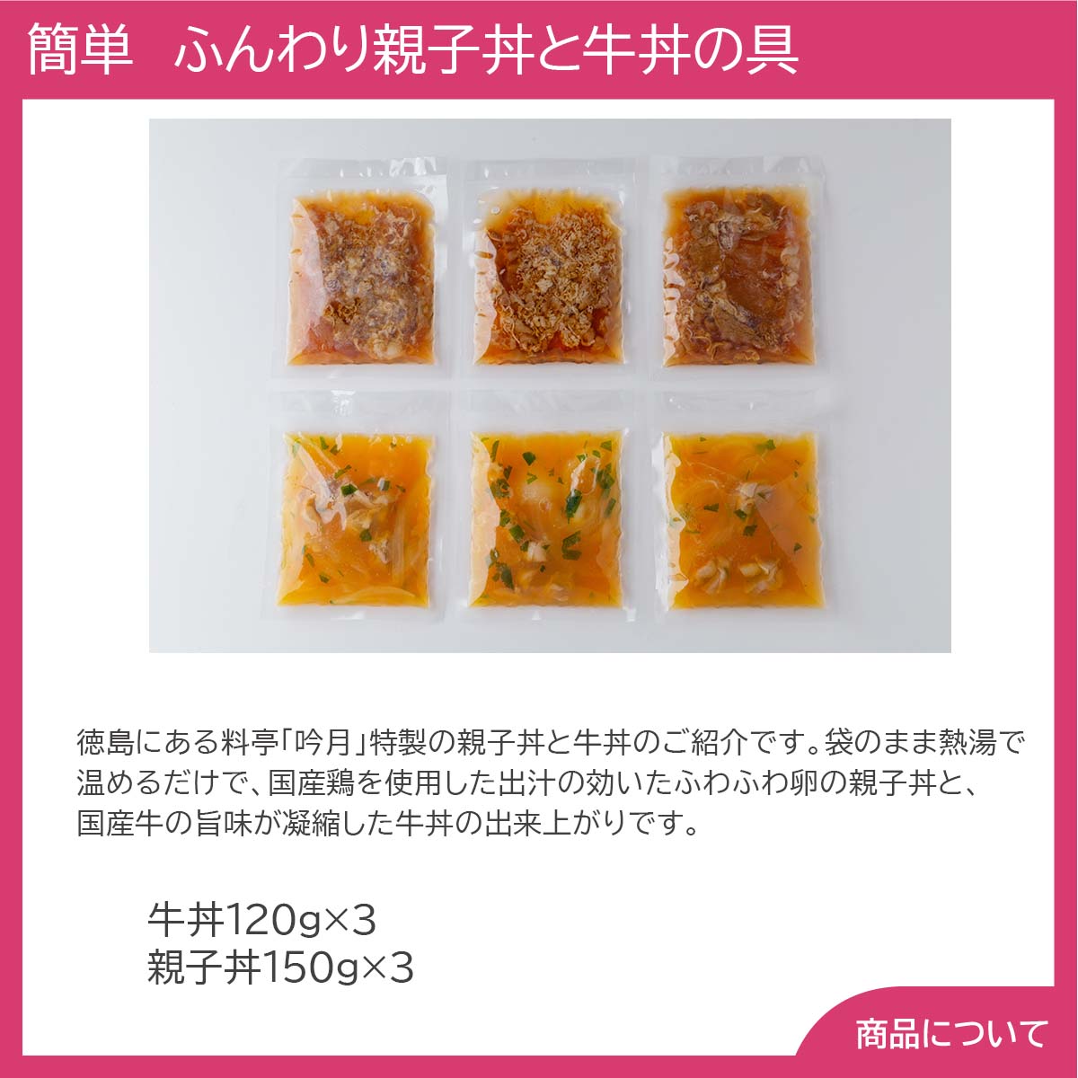 商品詳細 -Spec- 商品名 徳島 「吟月」 簡単 ふんわり親子丼と牛丼の具 内容量 牛丼120g×3、親子丼150g×3 アレルゲン特定 小麦、卵 出荷地 徳島県 保存方法 冷凍 賞味期間 出荷日より90日 コメント 徳島にある料亭「吟月」特製の親子丼と牛丼のご紹介です。袋のまま熱湯で温めるだけで、国産鶏を使用した出汁の効いたふわふわ卵の親子丼と、国産牛の旨味が凝縮した牛丼の出来上がりです。 【贈り物に最適です】 結婚祝い 出産内祝い 入園祝い 入学祝い 就職祝い 成人祝い 退職祝い 快気祝い 新築祝い 結婚内祝い 出産内祝い 快気内祝い 新築内祝い 引越し内祝い お歳暮 お中元 母の日 父の日 敬老の日 誕生日 結婚記念日 退職記念 お年賀 粗品 お見舞い 賞品 景品 お香典返しなど ※商品画像は一部イメージです。商品内容につきましては内容量をご確認下さいませ。撮影環境により、PC・ブラウザによって画像と実物では多少の色味が異なる場合がございます。アレルゲンはメーカーより提供されました情報を記載させて頂いておりますが、製造環境の変化や商品内容の一部仕様変更等により異なる場合がございます。誠にお手数ではございますが、商品到着の際、商品ラベルにてご確認を頂ますようよろしくお願い致します。