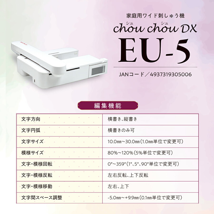 ■本体サイズ(約)…高さ126×幅393×奥行471mm ■重量(約)…4.2kg ■内容量…刺しゅう枠(大)、テンプレート(大)、刺しゅう押え、USBメモリ(4GB)、ブリッジA、B(隙間埋めプレート)、使用説明DVD 家庭用のワイド刺しゅう機(刺しゅう範囲200×130mm)です。 文字刺しゅう(漢字、ひらがな、カタカナ、アルファベット)内蔵 多彩な刺しゅう模様など、2,000種類以上の刺しゅう柄で作品作りをお楽しみいただけます。 さらに、USBメモリ対応なので新しい刺しゅうも追加できます。 ※「刺しゅう STUDIO 」ページからEU5対応の刺しゅう柄データをダウンロード刺しゅう機 シュシュ デラックス EU-5 ▼関連商品はこちら シンガー コンピューターミシン SF-190 Curio キュリオ シンガー コンピューターミシン SF-290 Curio キュリオ