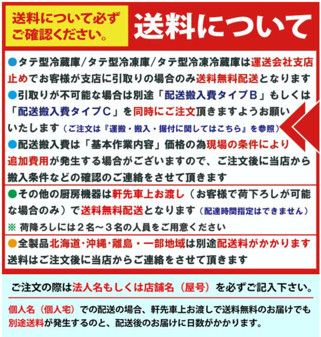 メーカー ジェーシーエム 型式 JCMF-1560T-IN 外形寸法 幅1,500mm × 奥行600mm × 高さ800mm 有効内容積 304L 庫内温度 -20℃〜 -15℃ 扉 ヨコ2枚扉 電源 単相100V 消費電力 380W [除霜時472W] 年間消費電力量 1,221kwh/年 製品質量 83Kg 付属品 棚網4枚 保証 期間:メーカー出荷日起算より1年 、 内容:メーカー規約に基づきます 備考 メーカー直送品となります。 販売価格には搬入設置費用は含まれておりません。 設置迄ご要望の場合は別途費用となりますがお申し付け下さい。 〜〜特徴〜〜 ・自然冷媒採用で環境にやさしい ・フロン排出抑制法の対象外製品の為、フロン管理不要 ・インバーター制御で年間電気代が大幅にコストダウン ・オートクローズ扉機能で冷気を逃さない ・自動霜取り後の排水は、コンプレッサの熱を利用した自然蒸発機能で排水設備が不要 ・庫内&内扉&ドレンパンはステンレス仕上げで丈夫で衛生的
