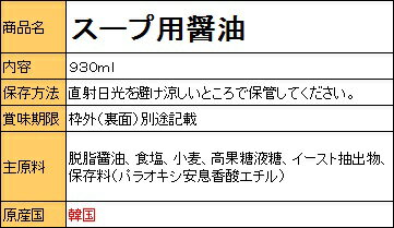 商品名 【センピョ】スープ醤油 内容量 930ml 保存方法 直射日光を避け涼しいところで保管してくさい。 商品説明 豆100%を伝統的な従来式の方法で味噌玉麹を寝かせ、太陽熱で長時間熟成させて作った伝統韓式醤油です。スープ料理に最適な色をしています。 原産国 韓国
