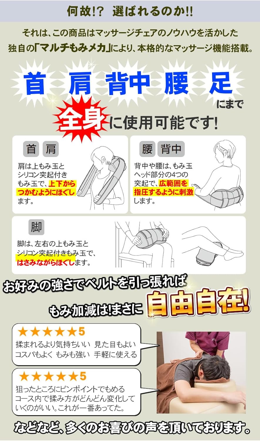 ・こだわりの癒し機能がマルチに使えて いつでもどこでもリラックスタイムできます。・光の色であなたをエスコート「LEDランプナビ」・肩・首から足裏まで。全身くまなくしっかりマッサージ・コードレス(充電式)で電気コードを気にせず、好きな場所で快適に使えます。※充電中も使えます。・販売名 マイリラ マルチマッサージャー・商品番号:MRL-M1・医療機器認証番号:301AABZX00011000(家庭用電気マッサージ器・管理医療機器)・定格電圧(50/60Hz)AC100V・定格消費電力 (50/60Hz)29W(ヒーター:9W)・ACアダプター定格:入力:AC100-240V 50 / 60Hz 0.8A、出力:DC14.5V 2.0A・充電所要時間:約3時間・連続使用時間:約40分 充電回数:約300回・タイマー:15分自動オフ・寸法:本体サイズ:(約) 幅37×奥行12×高さ18(cm)/ 首肩用ベルトサイズ:(約)長さ125×幅9×厚さ1(cm) / 梱包箱:幅39.5×奥行18.5×18.5(cm)・質量:本体:約1.9kg(ACアダプター含まず)/ 梱包箱:約2.5kg・素材:本体:ウレタンフォーム、ABS樹脂/ 本体生地:[BK]合成皮革 [IB]ポリエステル、レーヨン [FG.UG]ポリエステル / もみ玉カバー:品質表示タグ参照・もみ回数:遅い:約22回/分、速い:約31回/分、リズム:約20回/分・ヒーターの最高温度:もみ玉ヒーター40℃以下 ・電源:バッテリー式・特殊機能:ポータブル・耐水レベル:非防水