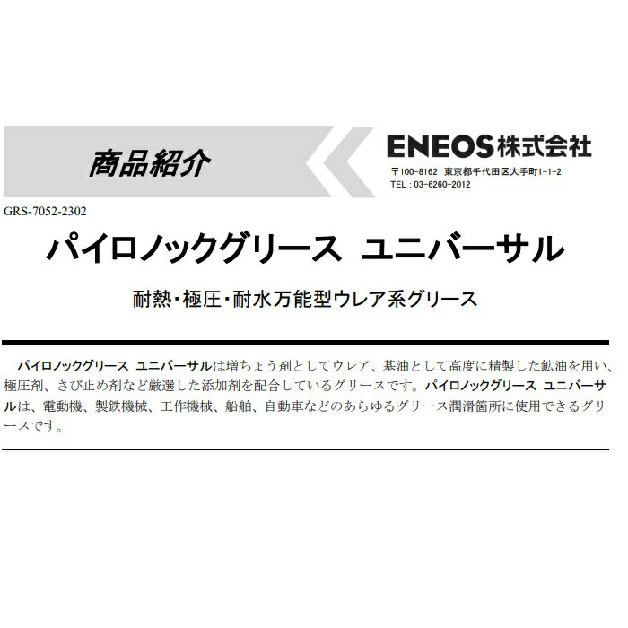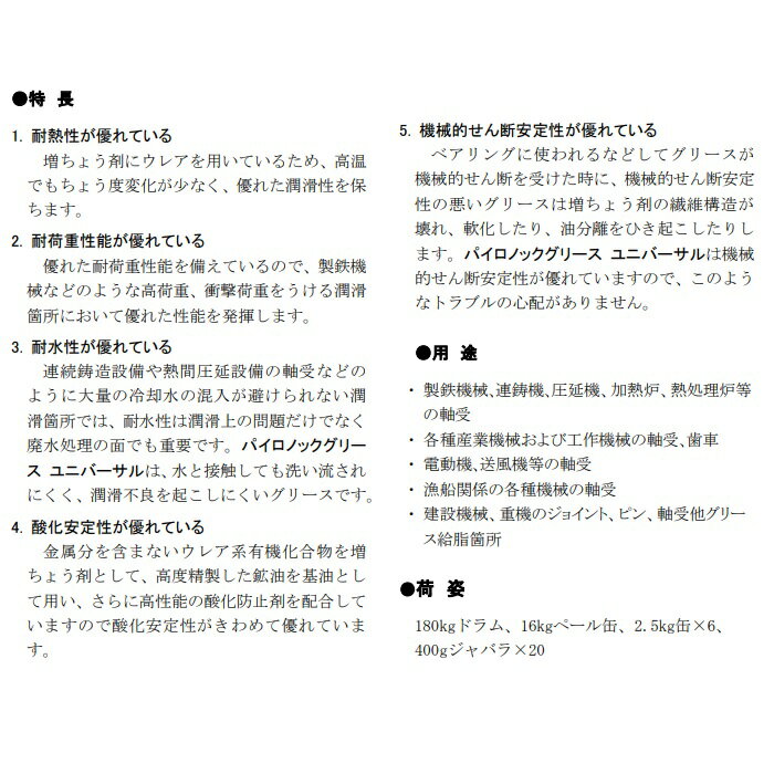 エネオス パイロノックグリース ユニバーサル 全ての番手(粘度)をそろえております! 別カタログで蛇腹1本から販売しております! [ 商品ラインナップ ] エネオス パイロノックグリース ユニバーサル0 エネオス パイロノックグリース ユニバーサル1 エネオス パイロノックグリース ユニバーサル2 [ 荷姿 ] 400g 20本 [ 用途 ] ● 製鉄機械、連鋳機、圧延機、加熱炉、熱処理炉等の軸受 ● 各種産業機械および工作機械の軸受、歯車 ● 電動機、送風機等の軸受 ● 漁船関係の各種機械の軸受 ● 建設機械、重機のジョイント、ピン、軸受他グリース給脂箇所