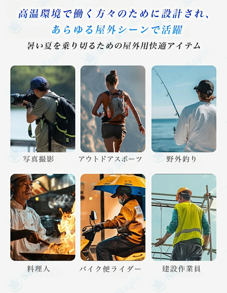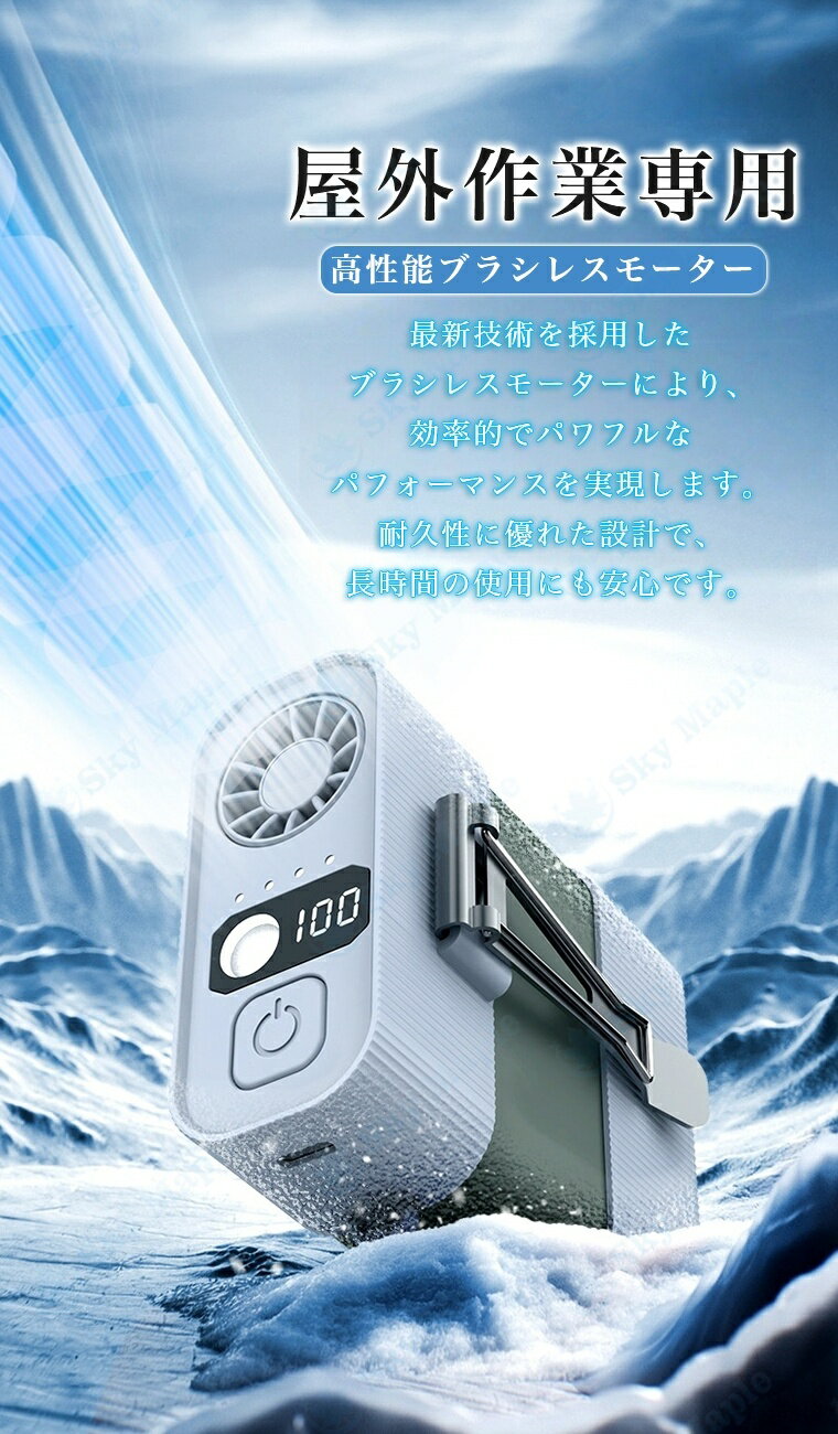仕様 素材: ABS + PC + 金属 + 電子部品 バッテリー容量: 4000mAh × 2 重量: 260g サイズ: 横46 × 縦90 × 奥89mm 充電時間: 4〜5時間 出力: 20W 風量調節: 4段階 入力: 5V/2A 電圧:7.4V カラー: グレーグリーン/ブラック/グリーンカーキ/ネイビー/スカイブルー/ライトイエロー/ホワイト/ダークグレー 特徴 ・強力風量&4段階調整 最新の高性能モーターを搭載し、コンパクトながらも強力な風を実現します。室内では微風、屋外では強風を楽しめます。ワンボタンで簡単に操作でき、屋外スポーツや旅行にも最適です。 ・4000mAh×2大容量バッテリー&Type-C充電 4000mAh×2の大容量バッテリーを搭載しており、長時間の使用が可能です。Type-C急速充電に対応しているため、短時間で充電が完了し、忙しい日常でも便利にお使いいただけます。通勤・通学、アウトドアなど、さまざまなシーンで活躍します。コンパクトで持ち運びやすく、ハンディや卓上での使用に最適です。首掛けや腰掛けスタイルでの使用も可能で、ハンズフリーで快適に使用できます。 ・LEDライト&SOSモード LEDライトと緊急時のSOSモードを搭載しており、キャンプや災害時にも安心して使用できる多機能ファンです。 ・ディスプレイ&省エネ設計 電池残量や風量が一目でわかるディスプレイ付き。高効率モーターで省エネ設計されており、環境にも優しい製品です。 ・作業用ファンの代替 4段階の風量調整が可能で、シンプルな操作で屋外作業や農作業、宅配、倉庫作業などで活躍します。アウトドアシーンでも頼れる快適さを提供します。 注意事項 ※本製品を使用する際には、必ず説明書に従って正確にご使用ください。 ※髪や皮膚が巻き込まれないように充分にご注意ください。使用中は周囲に注意を払ってください。 ※製品の仕様や詳細については、より良い品質を提供するために予告なく変更されることがあります。また、製品の実際の色味は、パッケージや印刷物と多少異なる場合がありますので、あらかじめご了承ください。 セット内容 ファン × 1 充電ケーブル × 1 ストラップ × 1 説明書× 1 備考 【ご注意ください】 ▼オーダー商品のためお客様都合によるキャンセル、返品、交換はお受けできません。 ▼画像はサンプルです。1点1点手作りのため、製作過程での傷汚れや画像との細かな違いなどがある場合がございますがご了承ください。 ▼ご使用されているパソコンのモニターや、携帯電話のメーカー、機種、画面設定等により、実際の商品の色と異なって見える場合がございます。色についての返品や交換はお受けできませんので予めご了承ください。 ▼セット内容のみの販売となり付属品などはついておりません。
