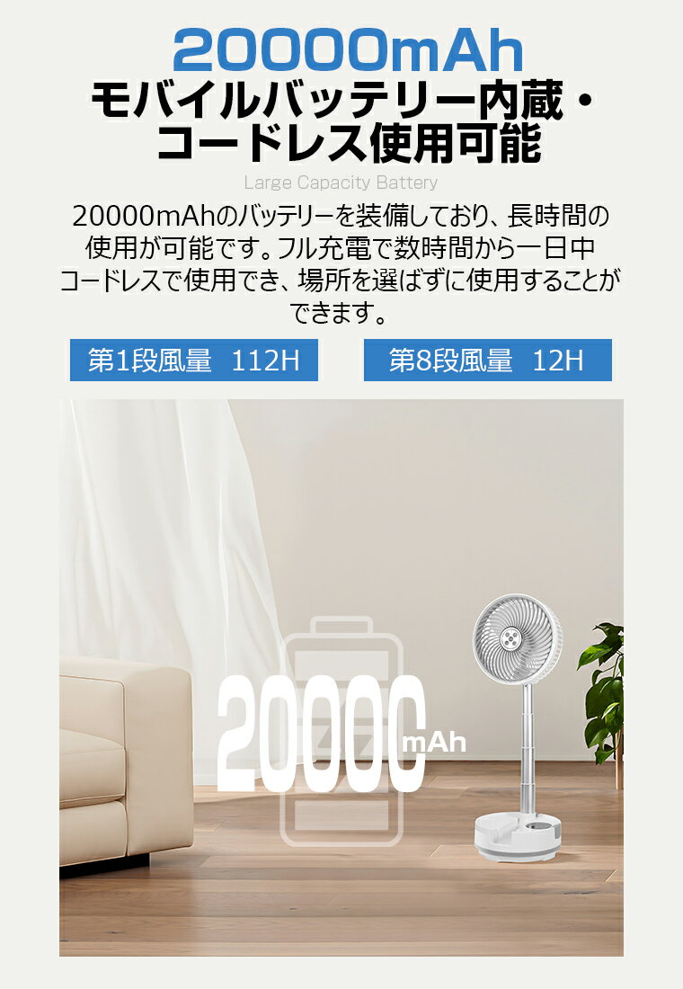 熱中症 扇風機 dcモーター サーキュレーター冷感タオル付【20000/40000mAh大容量バッテリー・8段階風量・4/5段高さ調整 】左右首振りリビング扇風機 コードレス充電式卓上 折りたたみ扇風機 強力送風 LEDライトタイマ防災車中泊 リモコン付き