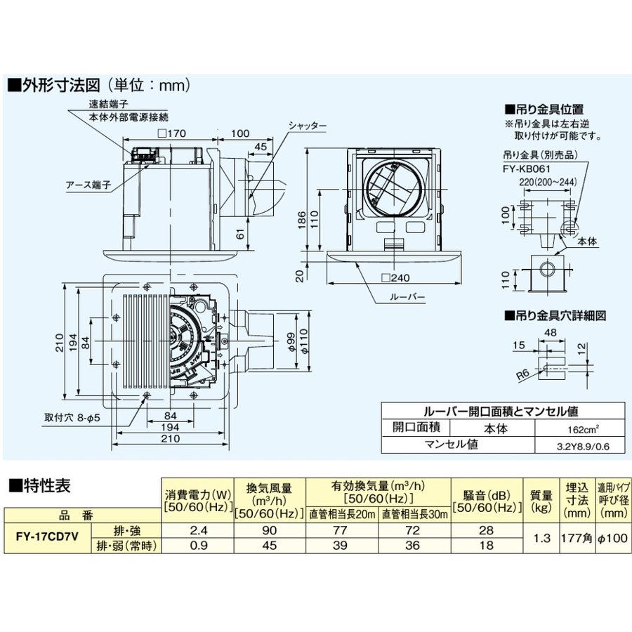 ※沖縄・離島への配送は追加送料を頂きます。 ご注文確認後に、こちらで変更させて頂きます。 送料表を確認しご了承の上ご注文をお願いします。 ・浴室/トイレ/洗面所/居室/廊下/ホール/事務所/店舗の換気に。 ・シンプルな樹脂製ホワイト格子ルーバーを標準装着した鋼板製本体の低騒音シリーズです。 ・高効率モーターとG・Cシロッコファンの採用で低消費電力です。 ・実使用時に耳障りな音域をカットした低騒音設計です。 ・スプリング式ワンタッチルーバーからオリフィス、羽根までが簡単に外せて簡単にお掃除できます。 ・風圧式高気密シャッター付。 ・24時間換気・電源接続部−本体外部速結端子 ・商品情報画像を参照してください。