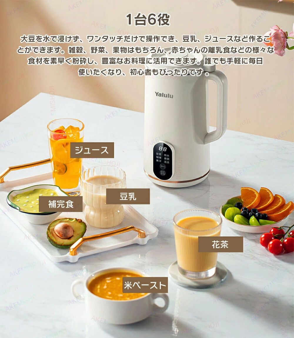 商品詳細製品仕様材質:ABS+304ステンレス サイズ:160x130x250mm 重量:1.1kg 容量:650ml 定格電圧:AC110V 50/60Hz 定格消費電力:加熱機能500W、ミキサー機能120W コンセント:アメリカ規格(変換アダプター付属) ※レシピは付属しておりませんので、予めご了承ください。特徴★6つのモード「豆乳・お湯・米ペースト・お粥・ジュース・洗浄」を搭載しております。ワンタッチだけで操作でき、あったか豆乳、コーンジュース、セロリジュースなど。雑穀、野菜、果物はもちろん、赤ちゃんの離乳食などの様々な食材を素早く粉砕し、豊富なお料理に活用できます。誰でも手軽に毎日使いたくなり、初心者もぴったりです。 ★12時間予約機能付きの全自動豆乳メーカーは、事前に食材を入れ、時間とコースを設定しておいてまま、翌日においしい朝食を楽しむことができます。使用後は水を入れてらくらく「洗浄」機能を選択すると、自動的に洗浄できるため、残留物を簡単に除去できます。忙しい朝にも楽々管理できるので健康習慣をしっかり続けられます。 ★濾過が不要で、滑らかな口当たりを実現します。乾燥豆を直接使用でき、予め浸す必要はありません。残留物がなく、出来立ての豆乳で良質なタンパク質と食物繊維を摂取でき、新鮮な大豆や野菜など具材に熱を加えて攪拌まで全自動で調理してくれます。 ★フードレベルステンレス製丈夫な刃ブレード10枚を採用し、優れい500W(加熱)と120W(ミキサー)のパワーモーターを搭載します。容量は650mlで一度に軽めの2~4人分は作れます。 ★自家製豆乳やジュース、健康的な生活へ。 豆乳が好きな方、野菜と果物が苦手なお子様、手軽に栄養を補いたい方、赤ちゃんの離乳食を作る方、歯の悪いお年寄りの食事を作る方などにお勧めの多機能豆乳メーカーです。注意▼産地:Made in CHINA ▼商品は簡易包装でお送り致します。 ▼お使いのモニターによっては、実際の色と若干異なって見える場合があります。 ▼ 製造時期によりデザインや仕様に若干の変更がある場合がございます。ご了承ください。 ▼実寸は素人採寸ですので、多少の誤差はご了承願います。 ▼この商品は当店実店舗でも販売しております。在庫数の更新は随時行っておりますが、 お買い上げいただいた商品が、品切れになってしまうこともございます。 その場合、お客様には必ず連絡をいたしますが、万が一入荷予定がない場合は、 キャンセルさせていただく場合もございますことをあらかじめご了承ください。商品詳細製品仕様材質:ABS+304ステンレス サイズ:160x130x250mm 重量:1.1kg 容量:650ml 定格電圧:AC110V 50/60Hz 定格消費電力:加熱機能500W、ミキサー機能120W コンセント:アメリカ規格(変換アダプター付属) ※レシピは付属しておりませんので、予めご了承ください。特徴★6つのモード「豆乳・お湯・米ペースト・お粥・ジュース・洗浄」を搭載しております。ワンタッチだけで操作でき、あったか豆乳、コーンジュース、セロリジュースなど。雑穀、野菜、果物はもちろん、赤ちゃんの離乳食などの様々な食材を素早く粉砕し、豊富なお料理に活用できます。誰でも手軽に毎日使いたくなり、初心者もぴったりです。 ★12時間予約機能付きの全自動豆乳メーカーは、事前に食材を入れ、時間とコースを設定しておいてまま、翌日においしい朝食を楽しむことができます。使用後は水を入れてらくらく「洗浄」機能を選択すると、自動的に洗浄できるため、残留物を簡単に除去できます。忙しい朝にも楽々管理できるので健康習慣をしっかり続けられます。 ★濾過が不要で、滑らかな口当たりを実現します。乾燥豆を直接使用でき、予め浸す必要はありません。残留物がなく、出来立ての豆乳で良質なタンパク質と食物繊維を摂取でき、新鮮な大豆や野菜など具材に熱を加えて攪拌まで全自動で調理してくれます。 ★フードレベルステンレス製丈夫な刃ブレード10枚を採用し、優れい500W(加熱)と120W(ミキサー)のパワーモーターを搭載します。容量は650mlで一度に軽めの2~4人分は作れます。 ★自家製豆乳やジュース、健康的な生活へ。 豆乳が好きな方、野菜と果物が苦手なお子様、手軽に栄養を補いたい方、赤ちゃんの離乳食を作る方、歯の悪いお年寄りの食事を作る方などにお勧めの多機能豆乳メーカーです。注意▼産地:Made in CHINA ▼商品は簡易包装でお送り致します。 ▼お使いのモニターによっては、実際の色と若干異なって見える場合があります。 ▼ 製造時期によりデザインや仕様に若干の変更がある場合がございます。ご了承ください。 ▼実寸は素人採寸ですので、多少の誤差はご了承願います。 ▼この商品は当店実店舗でも販売しております。在庫数の更新は随時行っておりますが、 お買い上げいただいた商品が、品切れになってしまうこともございます。 その場合、お客様には必ず連絡をいたしますが、万が一入荷予定がない場合は、 キャンセルさせていただく場合もございますことをあらかじめご了承ください。