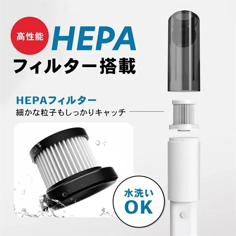 #カークリーナーにも最適なUSB充電式コードレスハンディクリーナーです!# 〜コンパクトなのに抜群の吸引力〜 【製品特徴】 (1)6000Paの強力な吸引力で、様々なゴミや、ペットの砂、車内の汚れなどを一瞬で吸い取ります。 (2)約296gの超軽量コンパクト設計!持ち運びが簡単で家でも車でも使えます。 (3)2000mAhの大容量リチウム電池搭載!1回の充電で35分の連続使用が可能です。(充電中には使用出来ません。) (4)HEPAフィルター搭載なので、細かな粒子もしっかりキャッチできます。 (5)ダストカップとフィルターは水洗い可能!乾かして繰り返し使用できるので非常に経済的です。 (6)ゴミ捨て簡単!本体とダストカップはひねるだけで簡単に分離できます。 【商品仕様】 ・サイズ:5.3×5.3×32.5cm ・重さ:約296g ・色 :2色 ・吸引力:6000Pa、動作音:65dB、稼働時間:約35分 ・電池容量:2000mAh ・充電時間:約4時間 ・内容:本体、フィルター、充電ケーブル、ブラシノズル、延長ノズル、補助コネクタ、予備フィルター