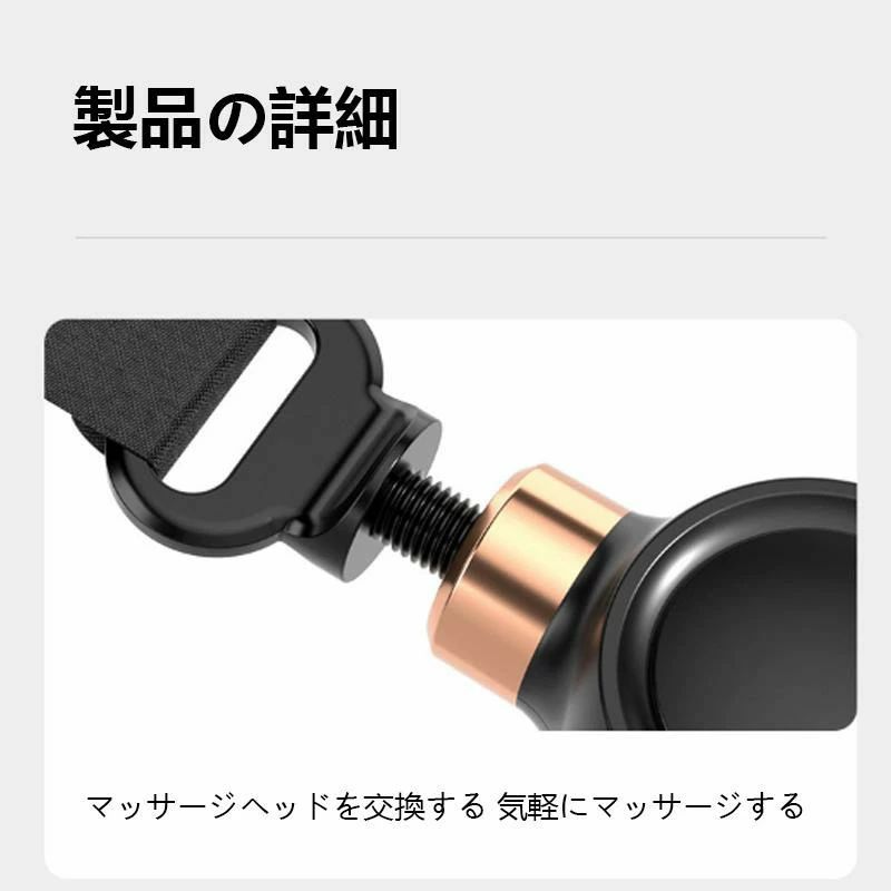 【仕様】●電源:usb充電●定格電圧:7.4V●回転速度:1800-3200回転/分●バッテリー容量:1800 mAh●充電時間:2.5時間●製品サイズ:約222mmx170mmx153mm(ヘット付き状態)●重量:585g【パッケージ内容】・マッサージガン本体・充電ケーブル・5つマッサージヘッド【5種類マッサージヘッド】U型ヘッド、錐型ヘッド、球型ヘッド、平型ヘッド、マッサージベルト【5種類のアタッチメント】●球型:腕、腰、背中、お尻、太もも、ふくらはぎなどの大筋肉群をマッサージするのに適しています●錐型:関節、手のひら、足底などの深層組織に適しています●平型:各筋肉部位のリラックス、シェイプ、足、腕部の深層刺激に適しています●U字型:首、脊椎アキレス腱のマッサージに適しています●マッサージベルト:多方位筋マッサージは筋肉の酸っぱさを簡単に緩和します【注意事項】※本製品は、治療等を目的とした医療機器・治療器・マッサージ機・マッサージ器・マッサージャーではありません。※写真と実物の商品の色合いが、ご使用のPCモニター、スマートフォンの液晶により、若干異なることもございます。
