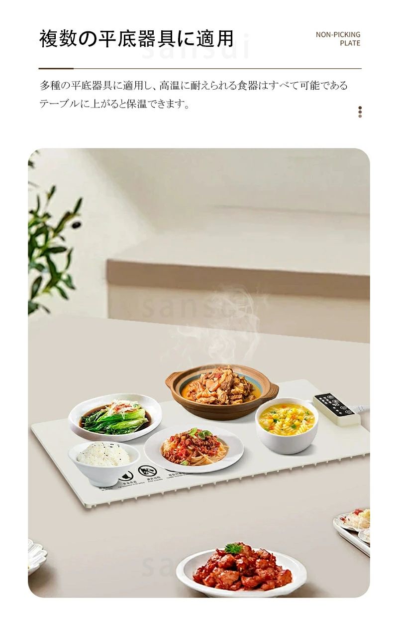 温度調節を備えた当社のビュッフェ パーティー加熱トレイは、食べ物を最大 6 時間温かく保ち、ご家族全員がおいしく楽しい食事体験を楽しめるようにします。 スマートな折りたたみ式デザインにより、簡単に収納でき、キッチンの貴重なスペースを節約できます。加熱エリアが広いため、さまざまな料理を同時に加熱でき、さまざまな調理ニーズに対応できます。 折りたたみ式フードウォーマーはナノシリコン素材で作られており、安全でお手入れが簡単なだけでなく、優れた保温性能を備えており、食べ物を温かく風味豊かに保ちます。高速3次熱伝達技術を利用して、最適な温度に素早く到達できます。 ビュッフェ フード ウォーマーは、金属、セラミック、ガラス、エナメルなど、さまざまな食器の素材に合うように設計されており、多用途性と利便性を高め、お客様の食事の好みにシームレスに適応します。 折りたたみ式の食品加熱パッドは、どのキッチンにも必需品です。毎日の食事の食器を温かく保ち、生地を発酵させ、冷凍食品を解凍し、家族の夕食、パーティー、イベント、ラマダンや安息日のお祝いに最適な温度を維持します。 ○使用上の注意事項○ ◆商品写真はできる限り実物の色に近づけるよう徹底しておりますが、 お使いのモニター設定、お部屋の照明等により実際の商品と色味が異なる場合がございます。 ◆製品寸法は手測りのため2〜3cmの誤差が生じる可能性がございます。ご理解いただければ幸いです。 ※改造/本来の目的以外/強い衝撃などはお控え下さい。 ※仕様は予告なく変更する場合があります。 ※生産により細かい点で雑に見えるものがございます。不良品ではありません。 ○以上を了承の上、ご購入ください○