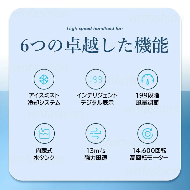 【商品詳細】 カラー:グレー、ホワイト、パープル サイズ:63.5x48x146.5MM 重量(約):198g 電池:3500mAh 素材:ABS 【適用シーン】 書斎 寝室 レストラン リビング 廊下 ダイニング キッチン ベッドルーム 子供 部屋 倉庫 飲食店 屋外 屋内 幼稚園 引き出物 引っ越し 新居 新築 改築 卓上 在宅勤務 寝室 【適用対象】 ワークマン メンズ レディース 旅行 釣り 通勤者 登山家 労働者 ゴルフ装備 女性用 男性用 男女兼用 10代 20代 30代 40代 50代 60代 【商品特徴】 数字表示モニター搭載:液晶画面で風力と残量を確認できるので、使いやすさ抜群。操作性の高い199段階の風力調整が可能です。 水タンク設計:素早く取り外し可能な水タンクで、氷水を入れることもでき、涼しさがさらにアップします。 冷却効果のある強力吹き出し:最新のアイスミストチップと13m/sの強風で、涼しい風を実現し、暑さを瞬時に解消します。 3500mAh大容量バッテリー:1回の充電で最大15時間使用可能なので、長時間の外出でも安心してお使いいただけます。 コンパクトサイズで持ち運びやすい:手のひらサイズのデザインは、どこへでも簡単に持っていけ、涼しさを持ち歩くことができます。 【商品説明】 高速噴霧ファンで爽快な夏を過ごしましょう!液晶ディスプレイで風力やバッテリー残量を確認できるこのミニファンは、199段階の風力調整に対応しており、あなたに最適な涼しさを提供します。 また、独自の水タンクにより、冷水や氷水を追加することでさらなる冷却効果を得られます。 13m/sという強力なタービン風とUSB充電式の3500mAhの大容量バッテリーにより、長時間の使用が可能です。 軽量かつコンパクトなデザインで、どこへでも持ち運べるため、常に快適な環境を維持できます。これ一台で夏の暑さから解放されましょう! 【注意事項】 ※手測りのため、少し誤差がございます。 ※画像はご覧になっているモニター等により実際の商品と多少色味が異なります。 ※本製品は海外輸入品となりますので、パッケージも海外パッケージ(中国/英語表記など)となっている場合がございます。 商品及びにパッケージの埃や傷と破損などはご容赦ください。 その理由による返品はお受け出来かねますのでご了承くださいませ。 ※受け取り者氏名は会社名または英語名では使用できません、本名で使用しなければなりません。 ※住所不備(番地抜け*集合住宅名*部屋番号)がございますと発送はストップいたしますのでご注意ください。 ※商品がお手元に届きましたら、商品に不具合が無いかご確認ください。万が一欠陥、不良、違う商品が届いた場合、配送中で商品が壊れたなどの原因で返品、交換のご希望の場合、必ず商品到着後7営業日以内にメール/お問い合わせにてご連絡ください。【商品詳細】 カラー:グレー、ホワイト、パープル サイズ:63.5x48x146.5MM 重量(約):198g 電池:3500mAh 素材:ABS 【適用シーン】 書斎 寝室 レストラン リビング 廊下 ダイニング キッチン ベッドルーム 子供 部屋 倉庫 飲食店 屋外 屋内 幼稚園 引き出物 引っ越し 新居 新築 改築 卓上 在宅勤務 寝室 【適用対象】 ワークマン メンズ レディース 旅行 釣り 通勤者 登山家 労働者 ゴルフ装備 女性用 男性用 男女兼用 10代 20代 30代 40代 50代 60代 【商品特徴】 数字表示モニター搭載:液晶画面で風力と残量を確認できるので、使いやすさ抜群。操作性の高い199段階の風力調整が可能です。 水タンク設計:素早く取り外し可能な水タンクで、氷水を入れることもでき、涼しさがさらにアップします。 冷却効果のある強力吹き出し:最新のアイスミストチップと13m/sの強風で、涼しい風を実現し、暑さを瞬時に解消します。 3500mAh大容量バッテリー:1回の充電で最大15時間使用可能なので、長時間の外出でも安心してお使いいただけます。 コンパクトサイズで持ち運びやすい:手のひらサイズのデザインは、どこへでも簡単に持っていけ、涼しさを持ち歩くことができます。 【商品説明】 高速噴霧ファンで爽快な夏を過ごしましょう!液晶ディスプレイで風力やバッテリー残量を確認できるこのミニファンは、199段階の風力調整に対応しており、あなたに最適な涼しさを提供します。 また、独自の水タンクにより、冷水や氷水を追加することでさらなる冷却効果を得られます。 13m/sという強力なタービン風とUSB充電式の3500mAhの大容量バッテリーにより、長時間の使用が可能です。 軽量かつコンパクトなデザインで、どこへでも持ち運べるため、常に快適な環境を維持できます。これ一台で夏の暑さから解放されましょう! 【注意事項】 ※手測りのため、少し誤差がございます。 ※画像はご覧になっているモニター等により実際の商品と多少色味が異なります。 ※本製品は海外輸入品となりますので、パッケージも海外パッケージ(中国/英語表記など)となっている場合がございます。 商品及びにパッケージの埃や傷と破損などはご容赦ください。 その理由による返品はお受け出来かねますのでご了承くださいませ。 ※