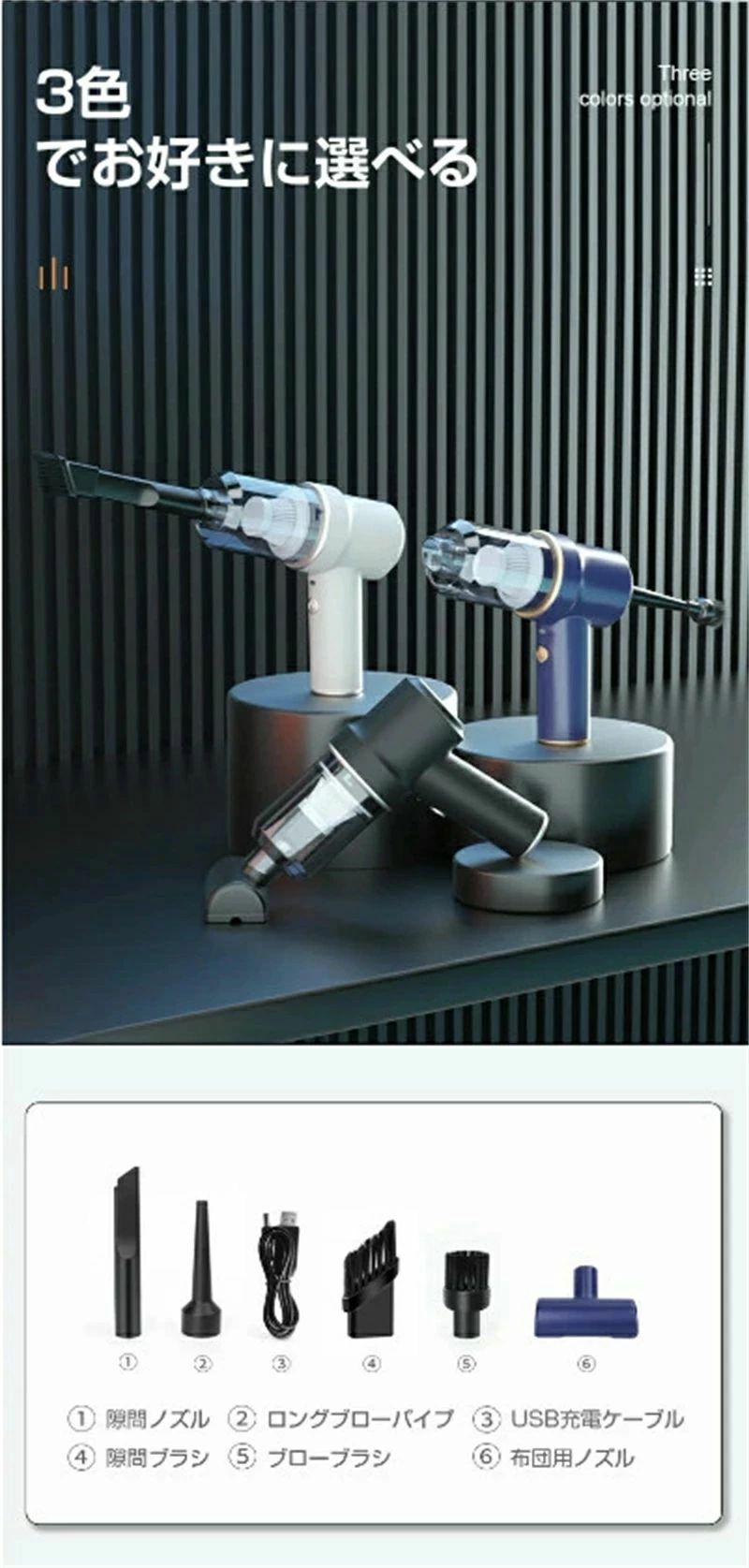 【多機能車用掃除機&超軽量】弊社の車用掃除機には、使用目的に応じて交換可能な6つのノズルが付属しています。ベッドの下、ブラインドの間、車のドアの隙間など、長い隙間ノズルで簡単にホコリを掃除することができます。平型ノズルは主に、布製のソファ、寝具、車のマットなどの表面の掃除に使用されます。3in1着脱式ノズルは、床、卓上、カーテンなど、主にほとんどの生活シーンで使用できます。 【4000mAh大容量&USB充電式&LED照明】大容量リチウムバッテリー、長持ち、使用時間伸ばす、大きな直列電流、理想的な状態で2時間充電完了、20分間継続的に使用可能。このハンディ掃除機 フィルターの動作音は60dB以下で、搭載されたLEDランプは、暗い隅でもゴミやホコリがはっきりと見え、自宅の掃除をより簡単にすることができます。 【取り外し可能なフィルター・ワイヤレス設計】高密度フィルターを搭載し、着脱簡易で、手入れしやすく、微細ほこりを有効に濾過し、汚れにくく、耐久性も高いです。車用に設計したワイヤレス設計。ワンハンドで握りやすい隙間にはいるので掃除がしいやす。 【お手入れ簡単】高密度のHEPAフィルターにより吸引されたホコリ、花粉などのゴミをキャッチして、キレイな空気を排出します。ダストカップとフィルターを水で洗えます。定期的なお手入れにをすることで、吸引力を長続きさせることができます。