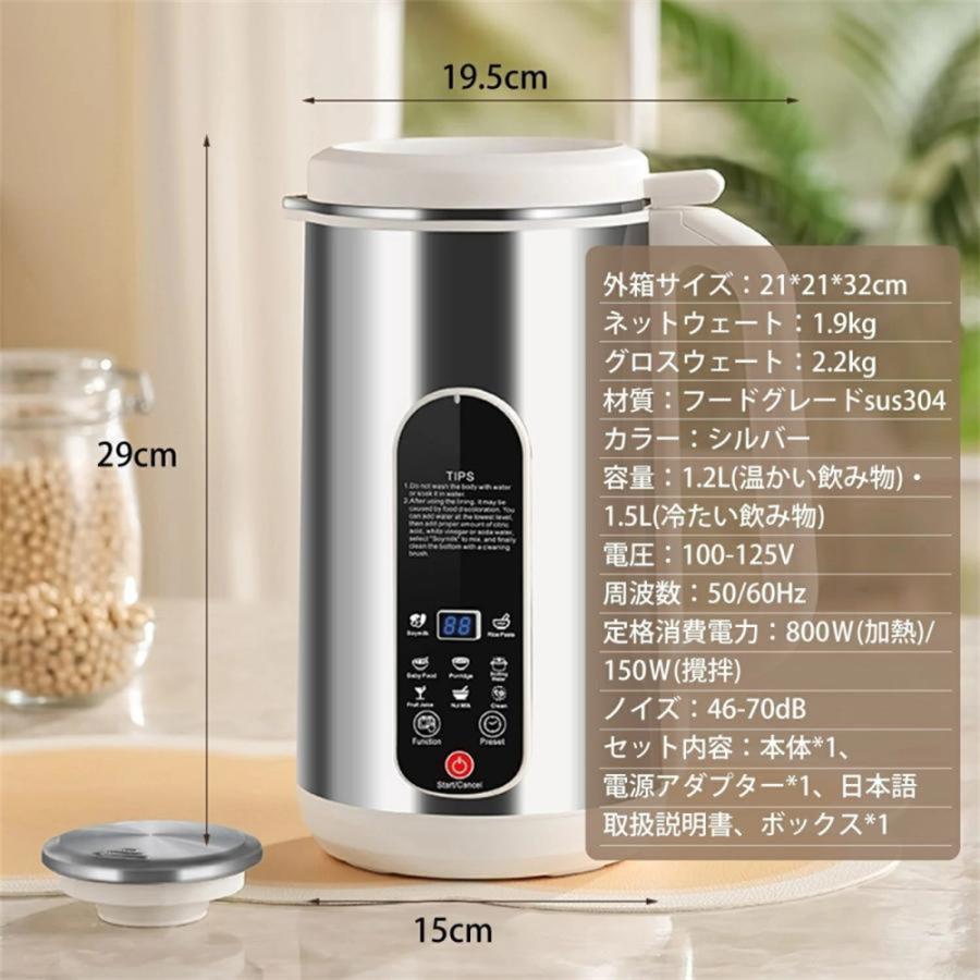 商品情報材質:フードグレードsus304 カラー:シルバー セット内容:本体*1、電源アダプター*1、ボックス*1特徴三層断熱防熱: 3層設計で、熱い飲み物を入れて手をやけどしないようにし、同時にポット内の熱をロックし、保温性がより良いです。 敏感プローブを内蔵し、煮込み温度を知能にバランスし、糊底しず、溢れず、十分に煮込み、新鮮で純粋な香りを引き出します。 LCD鮮明デジタル大画面: ボタンで8つの調理モードの設定が可能です: 豆を浸す手間を省き、急速に細かく煮て磨き、滑らかで濃厚な香りがして飲み続けて滓感がないです。 24Hスマート予約機能で、寝坊して慌ただしくなく、朝起きて暖かい飲み物を食べます。 ちょうど良い容量 :1-5人分の1.2L(温かい飲み物)・1.5L(冷たい飲み物)というちょうど良いサイズの上、かわいらしいデザインなのでキッチンに置いておいても気になりません。 使用後はコップに適量の清水を入れ、洗浄ボタンを押すとすぐに洗浄でき、手で洗うよりも便利で時間がかかります 高品質なモーターですが、静音だ:鋭利な12枚鋼刃を採用し、優れい800W(加熱)と150W(ミックス)のパワーモーターを搭載し、食材をフラッシュ粉砕し、食材栄養を細分化し、残留物を残さず、繊細な食感を向上させます。ノイズは46-70dBです。