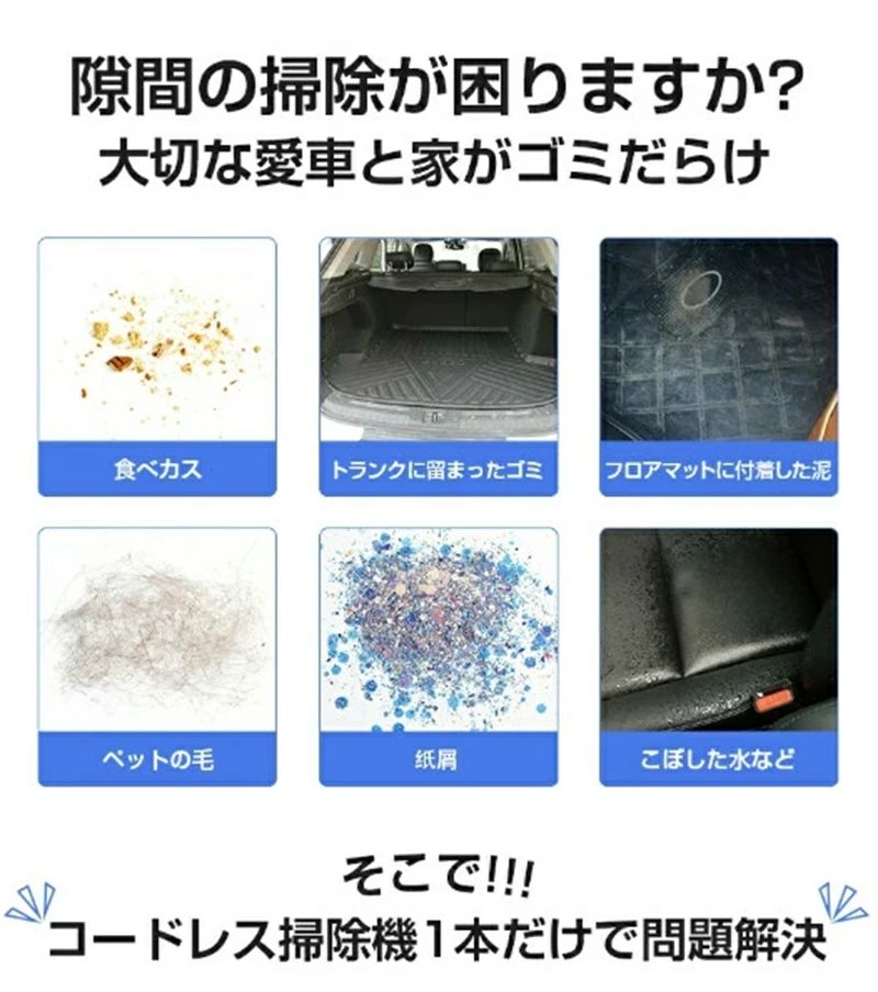 "【多機能車用掃除機&超軽量】弊社の車用掃除機には、使用目的に応じて交換可能な6つのノズルが付属しています。ベッドの下、ブラインドの間、車のドアの隙間など、長い隙間ノズルで簡単にホコリを掃除することができます。平型ノズルは主に、布製のソファ、寝具、車のマットなどの表面の掃除に使用されます。3in1着脱式ノズルは、床、卓上、カーテンなど、主にほとんどの生活シーンで使用できます。【4000mAh大容量&USB充電式&LED照明】大容量リチウムバッテリー、長持ち、使用時間伸ばす、大きな直列電流、理想的な状態で2時間充電完了、20分間継続的に使用可能。このハンディ掃除機 フィルターの動作音は60dB以下で、搭載されたLEDランプは、暗い隅でもゴミやホコリがはっきりと見え、自宅の掃除をより簡単にすることができます。【取り外し可能なフィルター・ワイヤレス設計】高密度フィルターを搭載し、着脱簡易で、手入れしやすく、微細ほこりを有効に濾過し、汚れにくく、耐久性も高いです。車用に設計したワイヤレス設計。ワンハンドで握りやすい隙間にはいるので掃除がしいやす。【お手入れ簡単】高密度のHEPAフィルターにより吸引されたホコリ、花粉などのゴミをキャッチして、キレイな空気を排出します。ダストカップとフィルターを水で洗えます。定期的なお手入れにをすることで、吸引力を長続きさせることができます。"