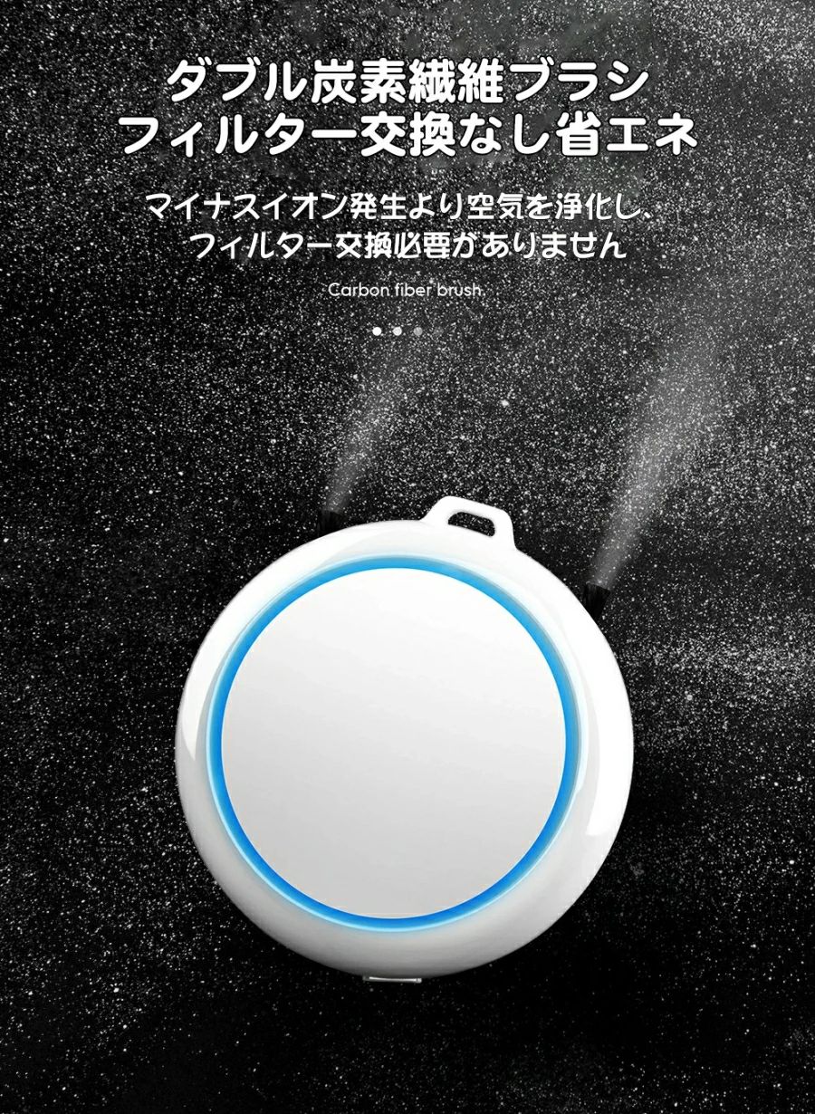 "【商品の詳細】*品名:首掛け空気清浄機*電圧:DC3.7V*出力:0.2W*電池容量:250mAh*重量:30g*サイズ:52mm*21mm*使用時間:低段階:約30時間;高段階:約18時間*材質:ABS+PC*充電時間:1.5時間*充電方法:USB充電【商品の紹介】【携帯空気清浄機&2段階マイナスイオン発生量】本体周りの1m3の範囲でマイナスイオンを生成し、空気中のPM2.5、ホルムアルデヒド、細菌、花粉、たばこの副流煙等に対し高い除去率を示します。空気中の粒子状物質を強力に分解し、あなたを守ります。マイナスイオン発生量は3000万、2億との2段階があり、環境の状況により自由に調節できる【優れた除去性能】空気中の浮遊物質(PM2.5や花粉、タバコの副流煙、ウイルス、細菌、異臭など)に対して高発生量なマイナスイオンで効率的に顔周辺の空気環境を改善していきます。個人的な服装、子供、高齢者、匂いや花粉アレルギーに敏感な妊婦には非常に適しています【軽量&携帯便利】ミニ、携帯用ネックレスのデザインで持ち運びに便利。 落下防止のストラップが付きなので、ネックレスのように長い時間着用しても、疲れを感じません。外観は精巧で、30gと軽量タイプで家族、友達、同僚にもいいプレゼントです【静音設計&USB充電】なめらかマナーモード設計気楽に楽しむ。運転モードは5dB以下邪魔にならずに安心。USB充電式で、利便性が満載します。1.5時間充電完了し、満電の状態で、低段階は約30時間連続稼働する;高段階には約18時間連稼働できる【フィルター交換なし、放射ゼロ】マイナスイオンの浄化システムを採用して、フィルタを変更する必要はありません。2億個までのマイナスイオンで、大気と室内の有害物質に汚染された空気を効果的に浄化します。扇風機、モーターと電磁放射がありません、あなたは新鮮な空気を楽しむことができて、また安心して寝つくことができます"