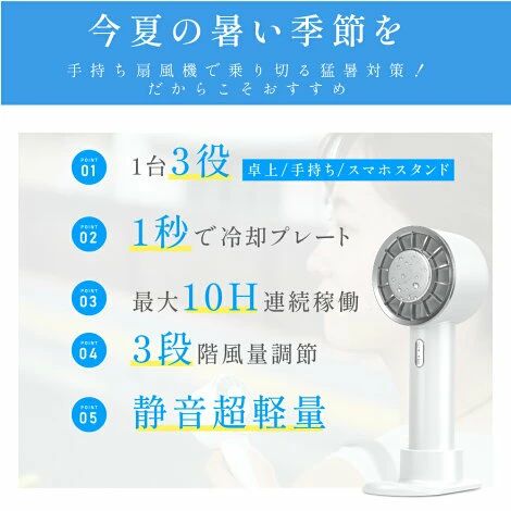商品情報商品情報商品説明定格電圧 DC5V商品電力 10W商品質量 約200G内蔵電池 2200MAH強度調節 3段階(風速)/1段階(冷却モード)暑い夏は、こんなお悩みで大変! 1.電車の中に人が多くて蒸し暑い; 2.汗だくで不快感; 3.メイク崩れ顔のほてり; 4.熱中症リスクが心配;A.商品特徴 1台5約の多機能(コンパクトなのに、この機能性を詰め込みました。ハンディファン&氷冷クーらー&冷却パック&卓上ファン&スマホスタンド)B.商品特徴 1秒で瞬間冷却(高性能の「ペルチェ素子」を採用。約1秒の瞬間-12℃冷却効果!)C.商品特徴 知ってますか?身体を効果的に冷やす方法!(こめかみ;首筋;背中;肘の内側;やけどの応急処置。)E.商品特徴 お手入れ簡単:ファンを取り外せば、水洗いOK!(付属パーツを取り外せば丸洗い可能、いつも清潔にご使用できます。)F.商品特徴 風量3段階調節+冷却モード(シーンにあわせて3段階風量と冷却モードを使い分けいただけます。)G.商品特徴 最大7時間連続稼働(充電は大容量の2200MAH、最大約7時間使えて外出先でも安心です。省エネ効率も抜群、エコロジーな製品として最適です。)H.商品特徴 静音設計(寝室や赤ちゃんのいるの部屋、会議室など場所を選ばずご使用いただけます。)I.商品特徴 軽量&コンパクトの収納(手のひらサイズで、軽量なので、持ち運びもラクラク)カラーバリエーション 1.ホワイト 2.グリーン注意事項製品は品質改良のため、予告なく仕様を変更する場合がございます。ペルチェ素子とは? ペルチェ素子ペルはチェ効果を応用した熱源素子の半導体電子部品です。電気を流して熱交換制御による熱源冷却機能があります。 利点:1.装置の部品が小さい、製品の小型・軽量化が容易 2.騒音・振動を発生しない 3.電流制御により吸熱をコントロールでき、高精度・高応答性も温度制御に適します検索用キーワード(製品説明ではありません) ポータブルファン ハンディクーラー クーラー 接触冷感 ミニ扇風 冷却プレート カラビナ 長時間 扇風機 ネッククーラー ハンディファン 持ち運び アウトドアファン 持ち歩き 扇風機 モバイルバッテリー ハンディ扇風機 充電式大容量 ハンディーファン ハンディファン 首かけ ミニ扇風機 静音 手持ち扇風機 携帯扇風機 卓上扇風機 扇風機 小型 扇風機 卓上 小型扇風機 usb扇風機 ギフト 充電式扇風機 卓上扇風機 静音 usbファン 卓上扇風機 usb 便利扇風機 熱中症対策 冷感アイテム 冷却扇風機 冷却ファン 冷風機 扇風機 dcモーター 扇風機 ハンディ 冷却グッズ 暑さ対策グッズ ミニ扇風機 ベビーカー 扇風機 usb 扇風機 ハンディ ファン 冷感ファン ポータブル扇風機 置き型冷風扇 ベッド 扇風機 ペルチェ素子 涼しいグッズ スポットクーラー 小型 送風機 アウトドア 扇風機 モバイル扇風機 車内 扇風機 簡易クーラーメーカー希望小売価格はメーカーサイトに基づいて掲載しています首かけ扇風機 充電式 小型 おしゃれ usb 手持ち 首かけ 卓上 7枚羽 充電式 ハンディファン スマホホルダー オフィス 事務所 省エネ 節電 手持ち 小型扇風機 携帯扇風機 扇風機 USB充電式 ネッククーラー ハンズフリー 熱中症対策 母の日ギフト 送料無料 ハンディファン ネックファン 首掛け 一台4役 涼しい くびかけ扇風機 ハンズフリー 小型扇風機 持ち運びに便利 ポータブル扇風機 アウトドア ギフト 羽根なし 母の日 5