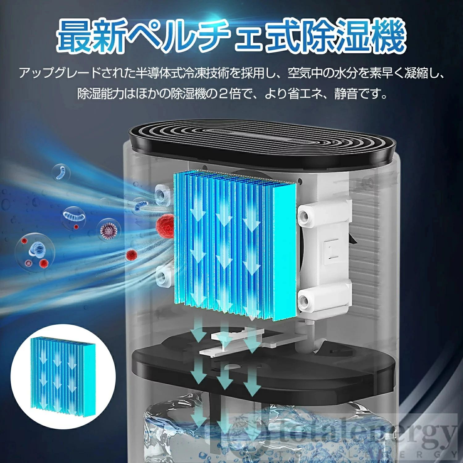 【製品詳細】●除湿可能面積(目安):木造18畳/プレハブ22畳/鉄筋25畳●排水タンク容量:約1.2L ●除湿方式:(除湿器)ペルチェット式 ●除湿能力(50Hz):500-600ml/日●本体サイズ:21cm * 13.3cm * 28.5cm●重量:2.7kg●定格消費電力:45W【除湿力抜群】1200mlのタンクを搭載、500-600ml/日の定格除湿力、梅雨時期、室内干しや夏の湿度に対策。ペルチェット式の除湿方式で、部屋の空気を冷やして湿気を水滴にして除去します。狭いスペースでもすんなりとフィットします。リビングルーム、寝室、キッチン、オフィス、勉強部屋、倉庫、洗濯場などいろいろな場所に適用。【自動停止機能&静音作業】弊社の除湿器は水タンク中の水がいっぱいになると、ランプが赤色に点滅になり、作業が自動的に停止し、睡眠中や留守の間にもタンクの水が溢れ出