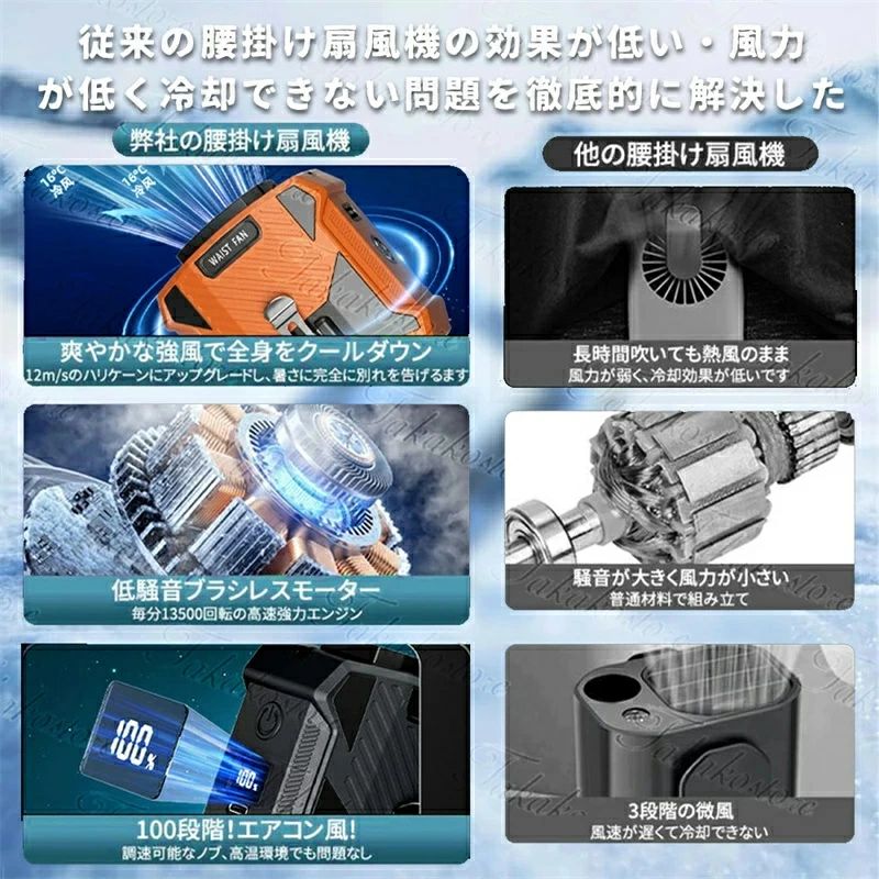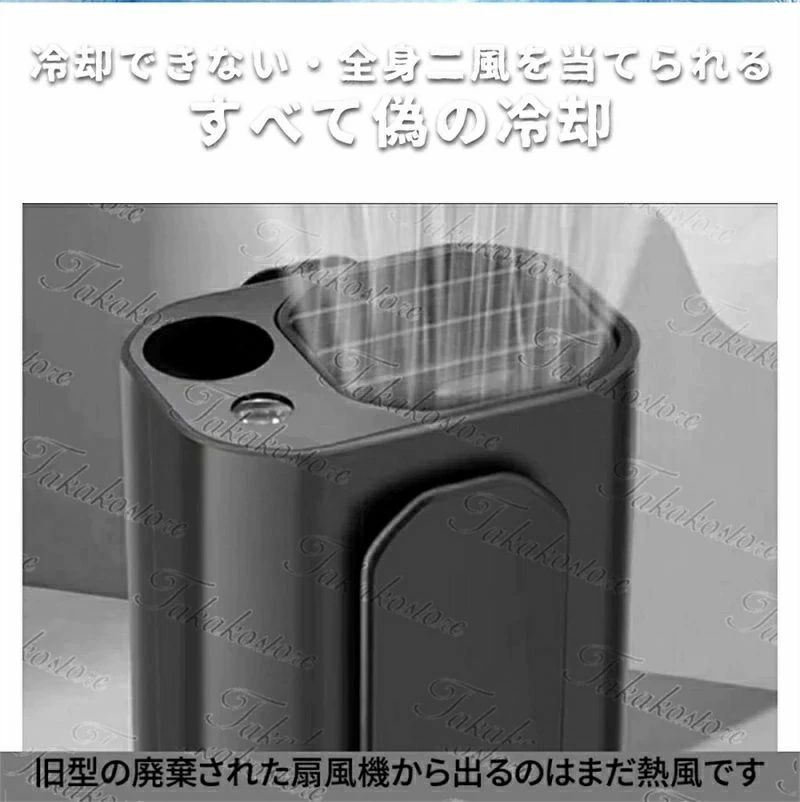 商品情報 素材:シリコン、ABS本体寸法:約縦98×横90×奥68.5mm重さ:約312g(電池含み)電源入力:DC/5V 2A充電時間:約5時間使用時間(5段階調節):一段階 約32時間二段階 約20時間三段階 約15時間四段階 約10.5時間五段階 約8時間梱包内容:扇風機本体*1、Type-C充電ケーブル(80cm)*1、ストラップ*1※注意事項 ※撮影の為、画質等の関係上、色などが実際の商品と若干違ってしまうこともあるかもしれませんがご理解のほどご入札ください。予めご了承ください。※製造時期によりデザインや仕様に若干の変更がある場合がございます。予めご了承ください。※本機を利用したことによる、直接もしくは間接的に生じた損害、破損について当店は一切の責任を負いません。【強力送風・大容量電池】 風力は通常の扇風機の10倍に達します。最大14M/Sな送風速度、16000RPM回転速度で3秒ほど360°全身が冷たい風に包まれます。内蔵の10000mAhリチウム電池、弱モードでは約45時間使用可能です。【空調服を完全に代わせ、暑い季節にピッタリ!】 ベルトに取付けてシャツの裾をクリップで挟んだら、服内に風を送り込めます。付属のストラップをつけば首にも引っ掛けられるので両手が解放され、使い勝手は良い。【5段階風量調節】 風量モードの強弱は5段階に切替えるので状況によって快適に調節できます。服の中を循環する風が汗を蒸発させ、体を涼しく体温の上昇を抑えます。【使い幅は広い】 夏のアウトドア、現場作業や犬の散歩、釣り、スポーツ観戦、ハイキングなど様々なシーンで大活躍。炎天下で体を動かし体力消耗の激しい方にお勧めします。【コンパクトでポータブル】 ベルトに装着できるし首にも引っ掛けるので両手で持つ手間を省けます。小型で軽量、持ち運びやすくいつでもどこでも快適です。