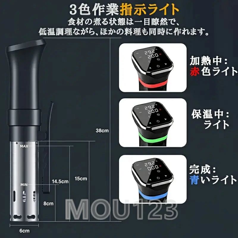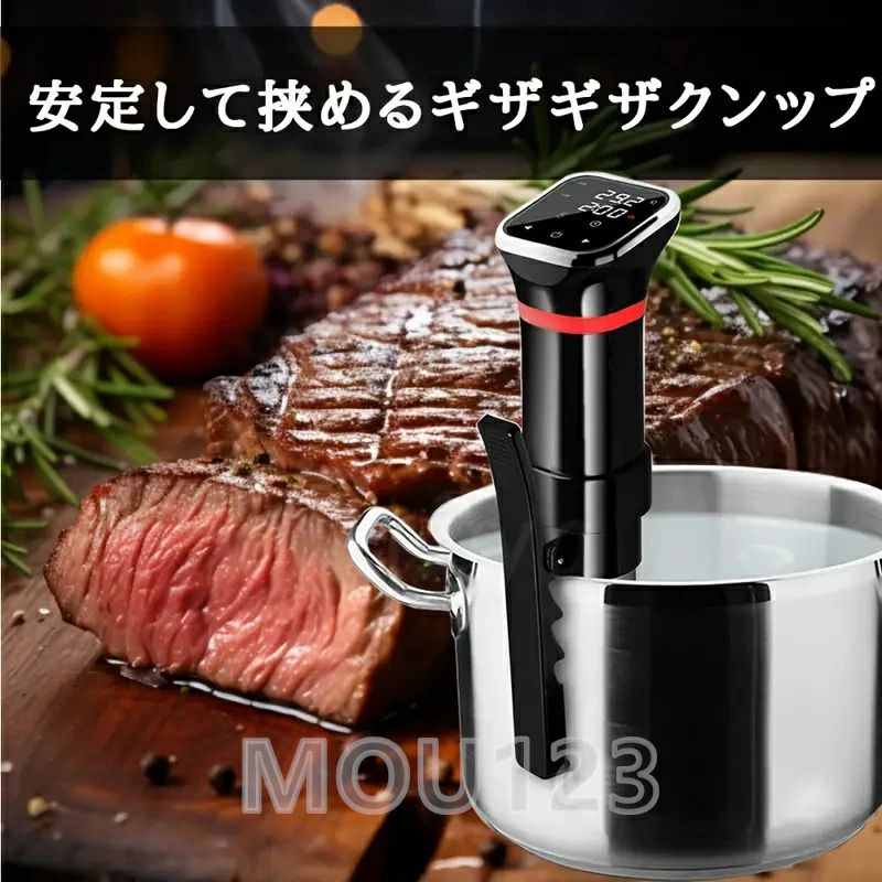 低温調理器【 新生活応援】 1100Wハイパワー スロークッカー 低温調理器具 24時間 予約機能 真空調理器 ッカー レシピ付き 低温調理 IPX7防水 温度設定 五重安心保護 高出力 日本語取扱説明書 低温調理器 1100Wハイパワー スロークッカー 低温調理器具 日本向けに設計 24時間 予約機能 IPX7防水 温度設定 五重安心保護 【24時間タイマー予約 時間と温度をコントロール25~95℃精密温度制御】 「タイム設定」を長押ししてタイマー予約機能に入ります。予約設定が完了すると、低温調理機が自動的に起動する。就寝前や出勤前に予約をして、起床後や帰宅時にすぐ食べられる。従来の調理では、火加減を把握するために常に注意を払う必要がある。この低温調理機には、スマートメタル温度センサーが搭載されて、過度調理の心配を気にせず、精確な時間に正確な温度で加熱してくれる。焦げる心配もなく、最大限食材の栄養素と風味を保留できる。 *温度設定は25 - 99℃まで、精度は±0.1°Cとなる。 時間設定は1分刻みで、0時間 - 99時間になる。【1100Wハイパワー 360°水循環で加熱】 プレスタイプクリップに滑り止めシリコンパッドを加えて、より安定して脱落しにくい低温調理器でき上がる。 3段階可調整によって、高さが異なる調理容器を使っても簡単に対応可能。ネジで固定されるタイプの調理器より手間が省ける。 精密調理器を任意の鍋や容器に取り付け、鍋や容器に水を入れ、密封された袋に食べ物を入れ、タッチパネル操作で料理を応じて温度と時間を設定して「ほっとく」時間を待つだけ。【低温調理 最上級クラスの料理を味わう】 低温調理器を使うことで、火加減がコントロールしにくい食材を一定の温度で加熱させることが可能。なお、多様なレシピがつくことで、たとえ料理に苦手な方が使ってもミシュランの星を獲得したレストランのシェフのようなパフォーマンスが再現できる。低温調理法は食材の元の味を引き出せる秘訣である。肉の水分を保つ上、肉質をさらにやわらかくすることで、豊かな風味が味わえる。【 五重安心保護】 安心安全な商品を供給することが一番重要な使命である。低温調理器の防水レベルはIPX7にたどり、お料理中や使用後のお手入れの際に、多少水がかかっても安心できる。また、本製品は燃焼防止センサー、温度センサー、水位感知センサー、110℃高温防止センサーが四つも搭載されて、保証期間は12カ月間になる。 *ご不明な点や万が一の不具合などが発生した場合は、当店までご連絡いただきますようお願い申し上げます。その際は、速やかに対応させていただきます。 5