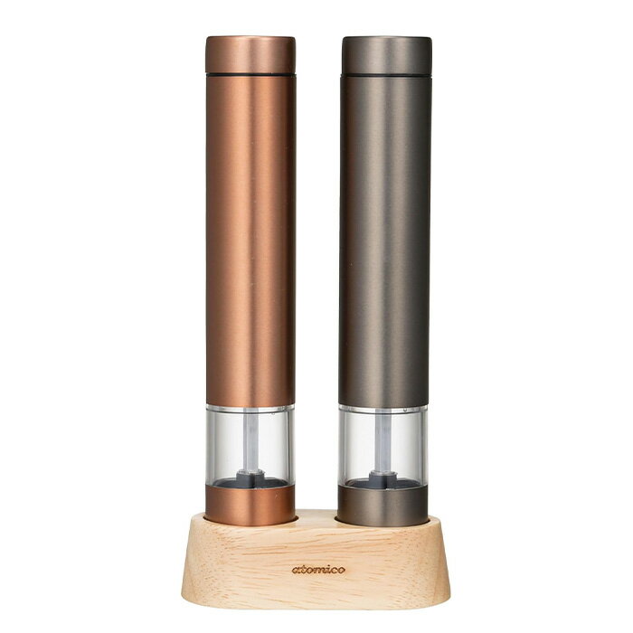 シービージャパン 電動ミル ペッパーミル カッパー&グラファイトグレー 2本セット 専用ウッドスタンド付 岩塩 胡椒 スパイス 粗さ調節可能 atomico