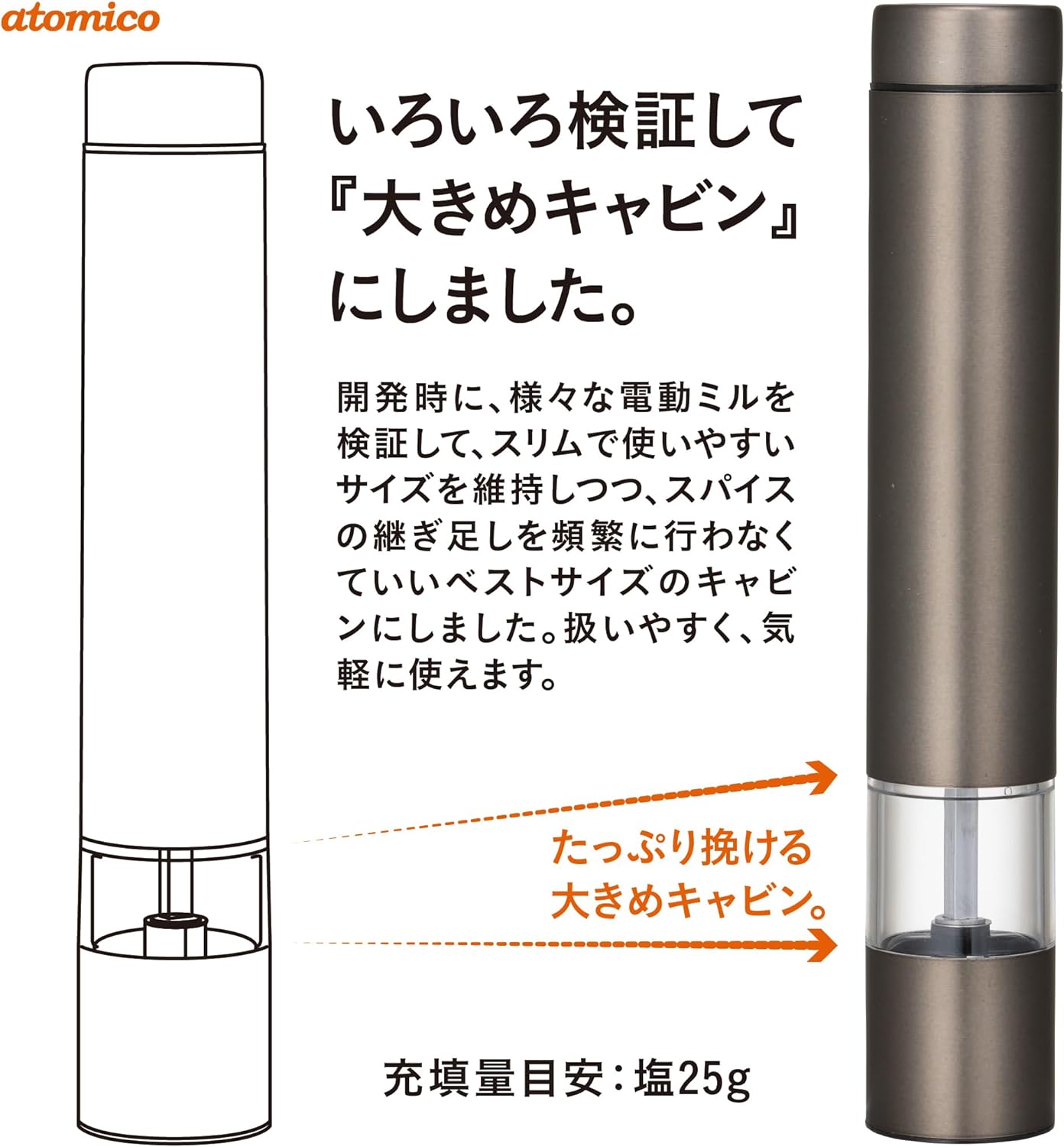 スイッチを押すだけで誰でも簡単にスパイスを挽ける「atomico(アトミコ)ソルト&ペッパー電動ミル」電動式なので料理中も手を休めることなく、さっと片手で挽きたての新鮮なスパイスを楽しめます。 サビの心配がなく岩塩も挽けるセラミック製の刃なので、ブラックペッパーの実でも難なく快適に挽けます。摩擦熱が生じにくいため、熱で飛びやすいスパイスの香りを保ちます。 先端のダイヤルを捻るだけで、粗いものから細かいものまで、挽き方を自在に調節出来ます。料理に合わせて、お好みの挽き具合をお楽しみ下さい。 専用の収納台がついているので、キッチンや卓上のよく使う場所に置いておけます。本体はステンレスの質感と落ち着いたカラーリングで、食卓をちょっぴり上品に演出します。 スリムでコンパクトな形状なのに充鎮量は、たっぷり挽ける25g。スパイスの継ぎ足しを頻繁に行わなくていいので、扱いやすく、気軽に使えます。 ※入れられる量は、スパイスの形状によって変わります。 ステンレス銅、ABS樹脂、ポリカーボネート、セラミック