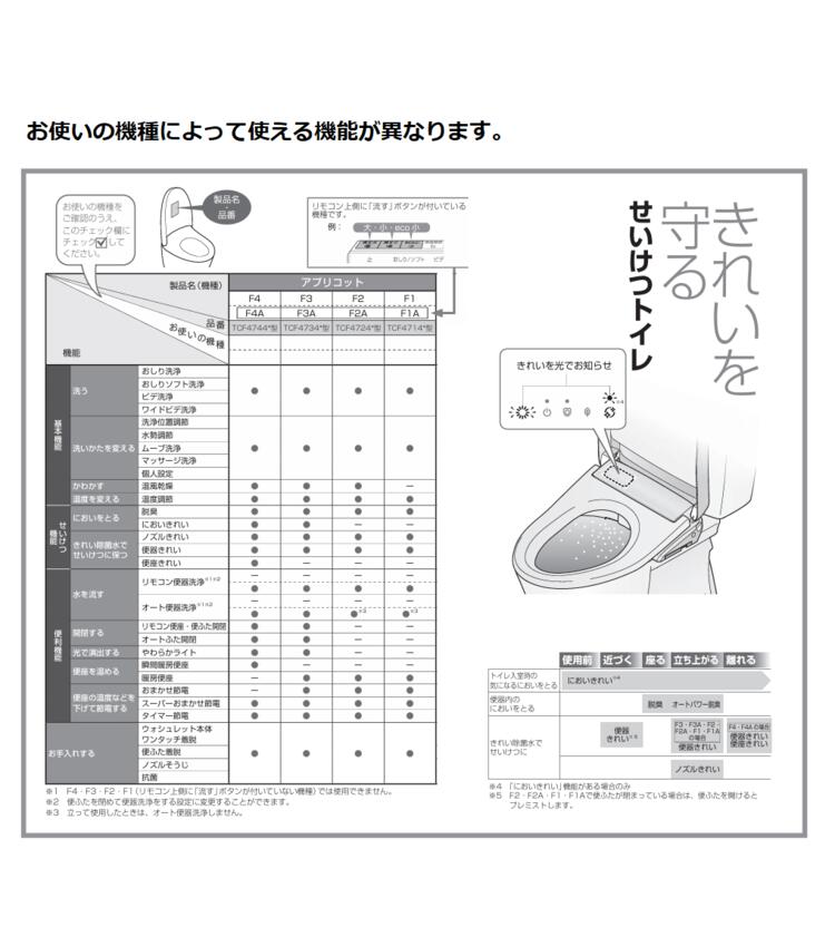 TOTO ウォシュレット TCF4714AF アプリコットF1A トイレも洗う、ウォシュレット。 オート便器洗浄付タイプ ■清潔 『きれい除菌水』で、きれいが長持ち。 ■エコロジー 使用しない時間の電力を抑えて、かしこく節電。 ■洗い心地 洗浄力と快適さにこだわった、上質な洗い心地。 ■お掃除 すみずみまでラクにお手入れ。 トイレ掃除に差が出ます。 ※向かってタンクの前面左に洗浄レバーが付いているタイプ用(TOTO製)